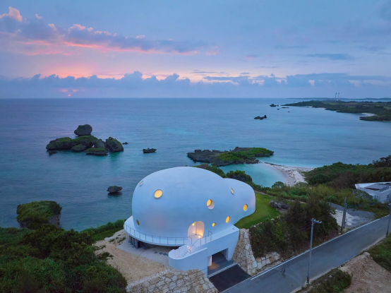 Yuputira 住宅是建筑師 Mariko Mori 的第一個住宅項目,是位于宮古島的一個工作室和靜修所。該物業(yè)以埃及太陽神命名,被設計成一個用于創(chuàng)意、儀式和冥想的空間。這座雕塑般、球體狀、純白色的建筑——是與 Ring Architects 及當?shù)毓そ澈献鲃?chuàng)建的——靈感來自島上的珊瑚礁,象征著海洋生態(tài)系統(tǒng)的脆弱性。其有機形態(tài)意味著結(jié)構(gòu)不會與環(huán)境沖突,強化了 Mori 對生態(tài)和諧的承諾。內(nèi)部極簡主義的空間——包括工作室、客房和一個傳統(tǒng)茶室——全部采用白色裝飾。