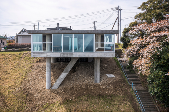 Tato Architects 在日本南部神戶鎮(zhèn)的山坡上設計了抬高的Rokko House。該兩層住宅位于山區(qū),采用鋼框架和玻璃墻。底層,透明的墻壁圍合著廚房和餐廳。一樓用于娛樂、創(chuàng)作音樂或工作,而樓上的二樓則設有臥室和儲物空間。