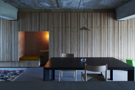 這座粗野主義藝術(shù)家工作室的靈感源于一個泰國節(jié)日。設計師 Ab Rogers 和藝術(shù)家 Hiraki Sawa 于2018年在泰國一年一度的Wonderfruit聚會上相識,并因魚而結(jié)緣(兩人都是烹飪愛好者)。Sawa 曾在斯萊德藝術(shù)學院師從英國藝術(shù)家 Phyllida Barlow,以短片和拼貼動畫聞名,他于2019年接管了一個毛坯的空辦公室空間,最初計劃與商業(yè)伙伴建立一個小型聯(lián)合辦公空間。隨后他改變了策略,決定創(chuàng)造一些更冒險、打破類型化的東西,他稱之為“共在(co-being)”空間。