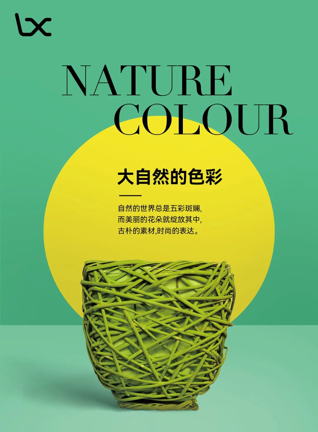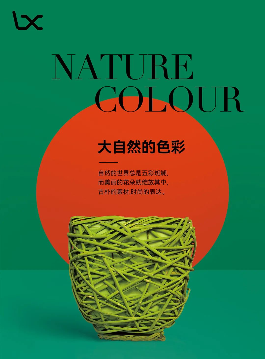 下圖一個手工家居品牌的海報,產(chǎn)品是一個草綠色的編織花盆,標題是:大自然的色彩。根據(jù)上面這些信息,我們大概能判斷出該海報的配色應該要有自然、簡約、安靜、輕松的感覺。但下圖的顏色整體偏暗,而且中間的紅色圓形與背景色和產(chǎn)品對比太強,所以視覺上并沒有自然、輕松的感覺。