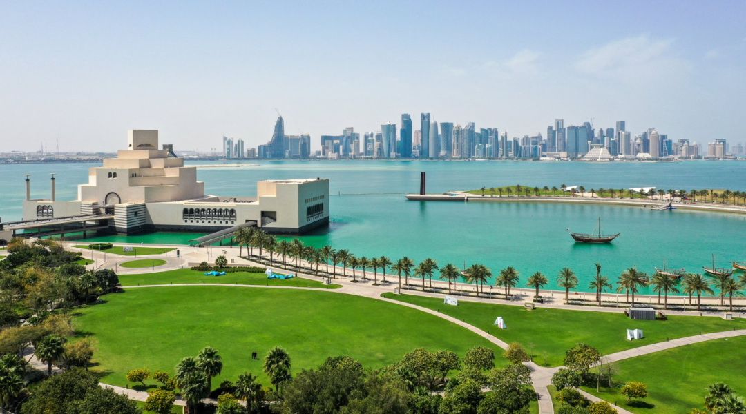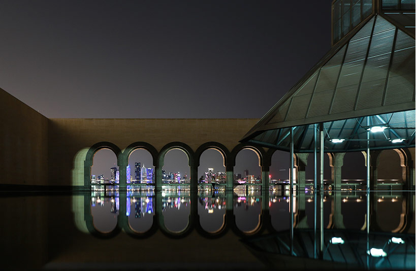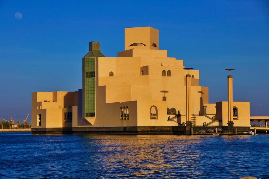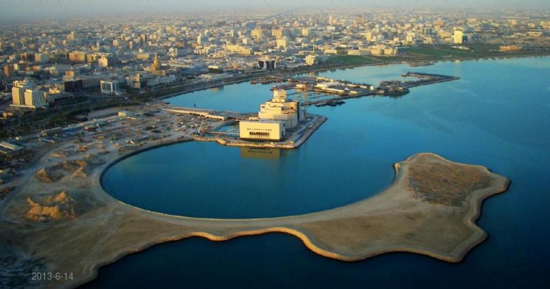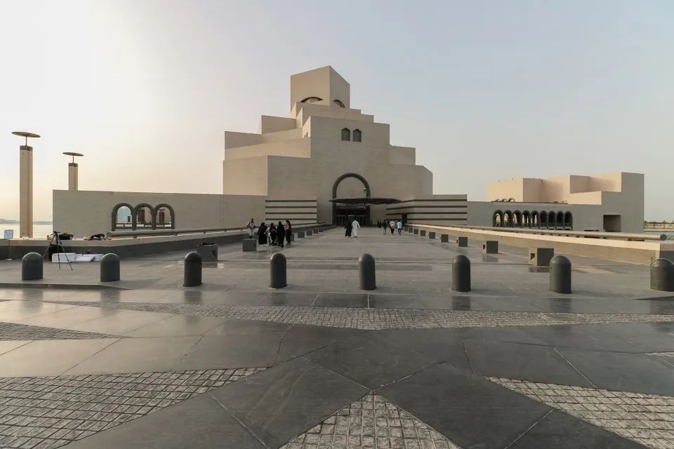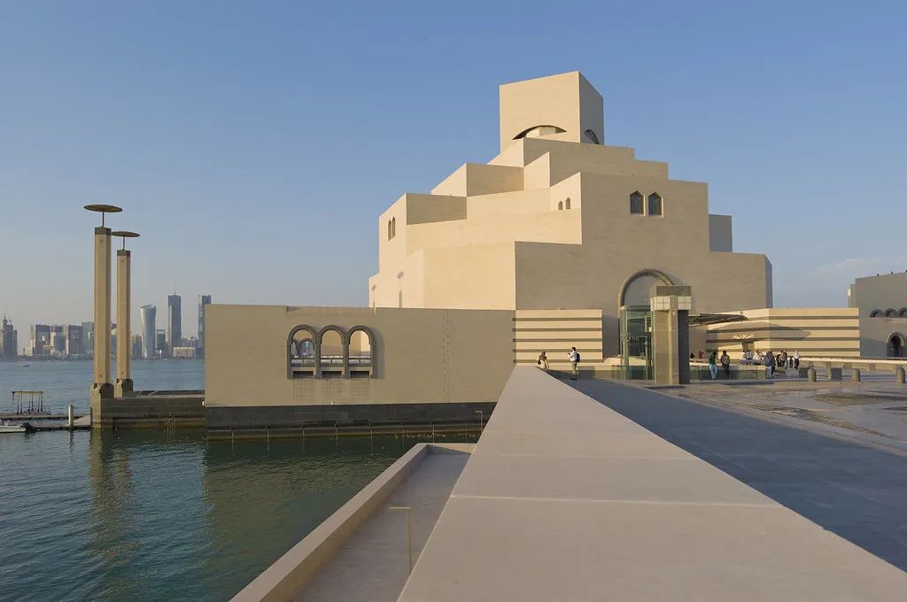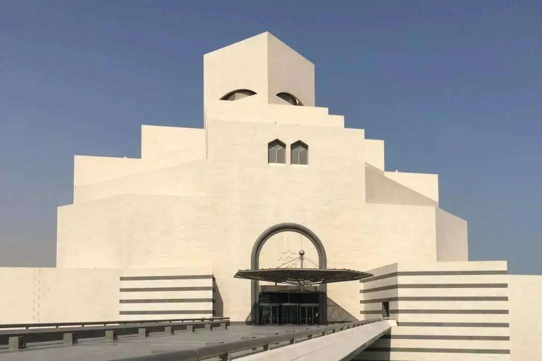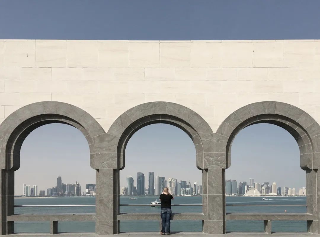 透過圓拱外墻可以清晰看到蔚藍海面和多哈現代建筑天際線。