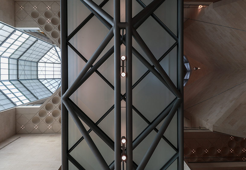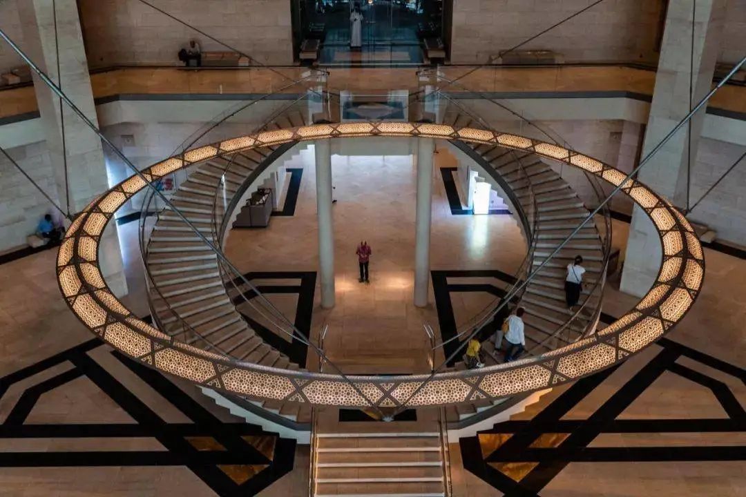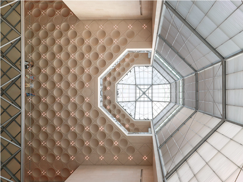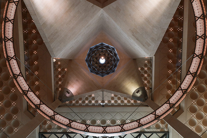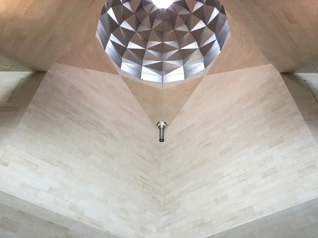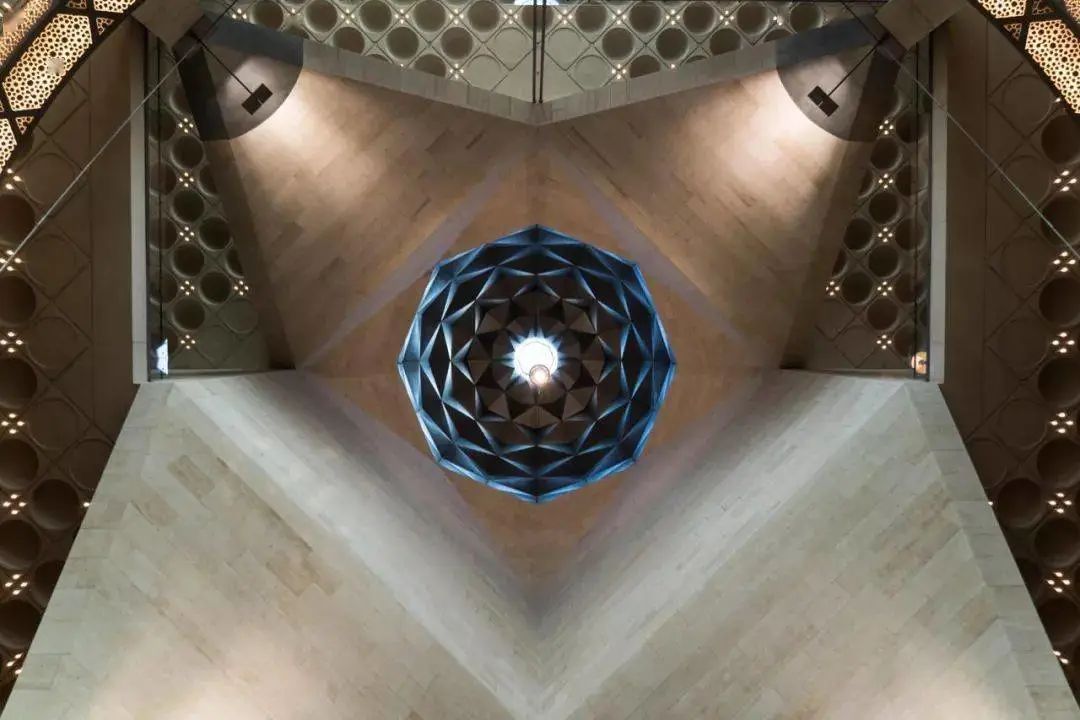 樓梯的第三級位于穹頂中心正下方,穹頂的設計靈感來自伊斯蘭傳統建筑,并通過現代設計手法進行了提煉,圖案從圓形過渡到八邊形再到正方形,最后到四個不同高度的三角形結構,形成了中庭的支柱。