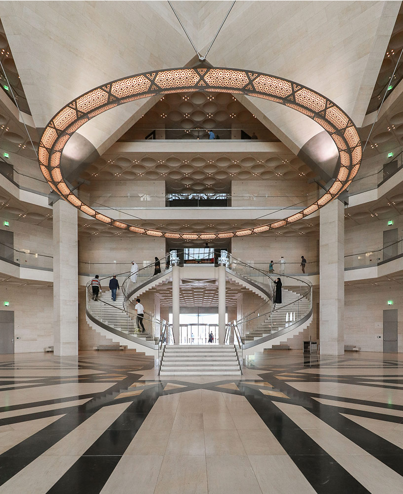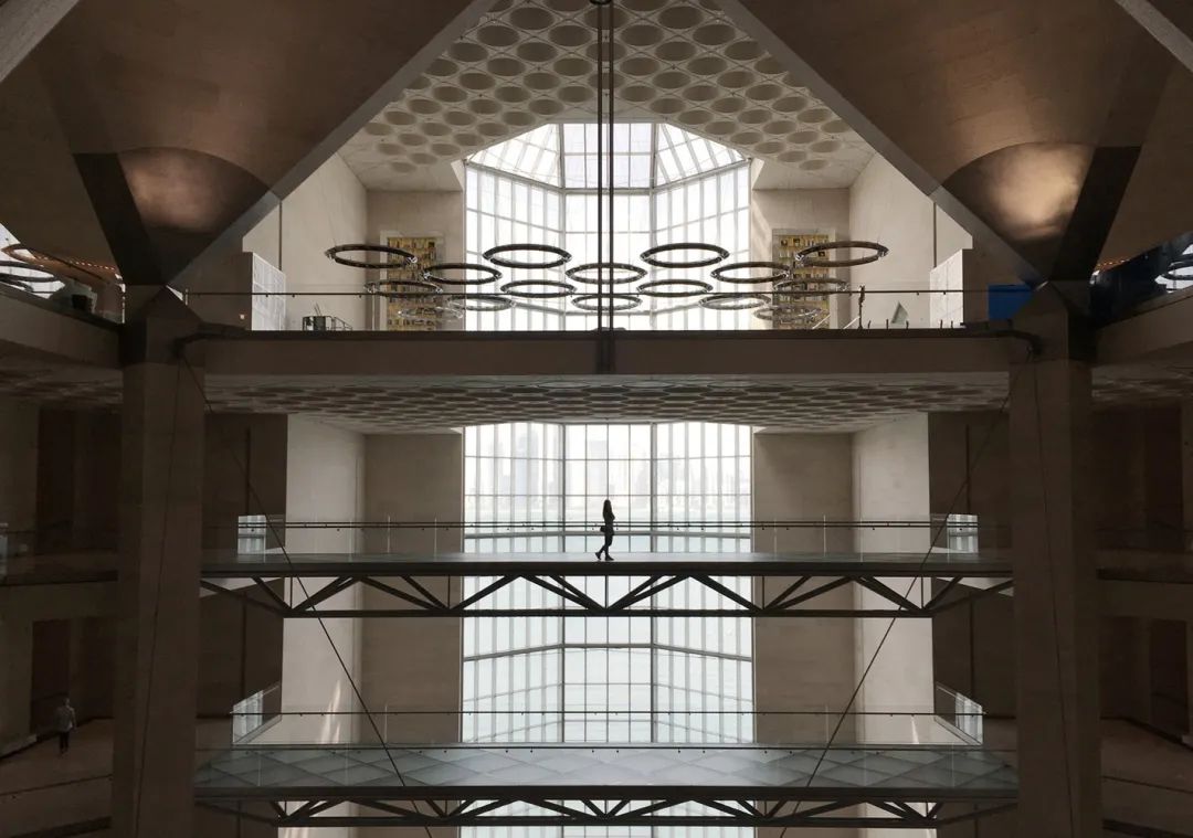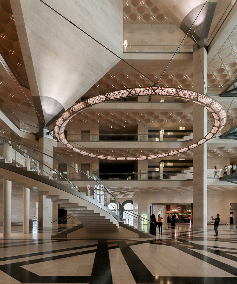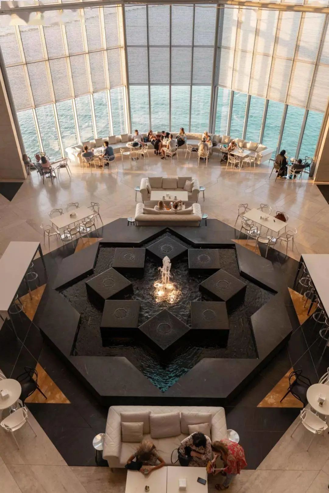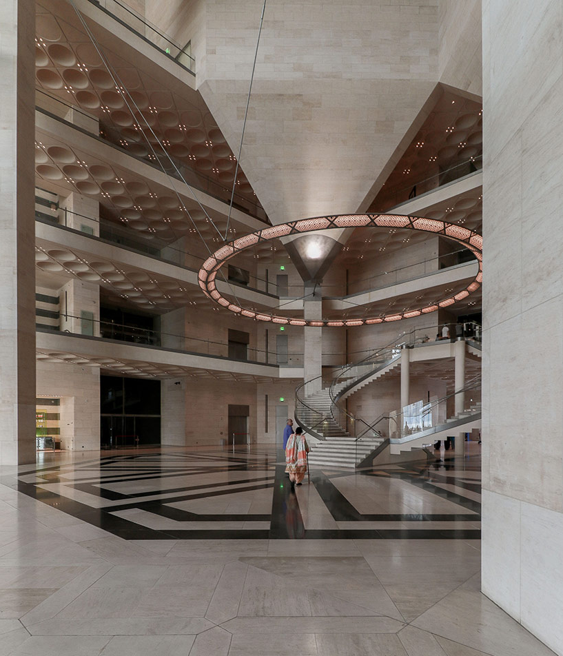 樓梯的第三級位于穹頂中心正下方,穹頂的設計靈感來自伊斯蘭傳統建筑,并通過現代設計手法進行了提煉,圖案從圓形過渡到八邊形再到正方形,最后到四個不同高度的三角形結構,形成了中庭的支柱。
