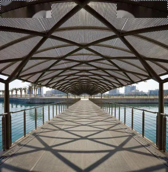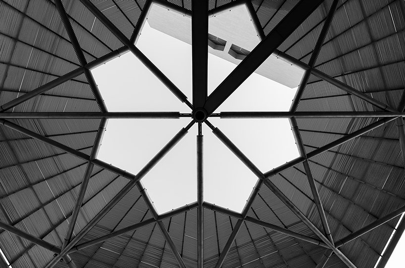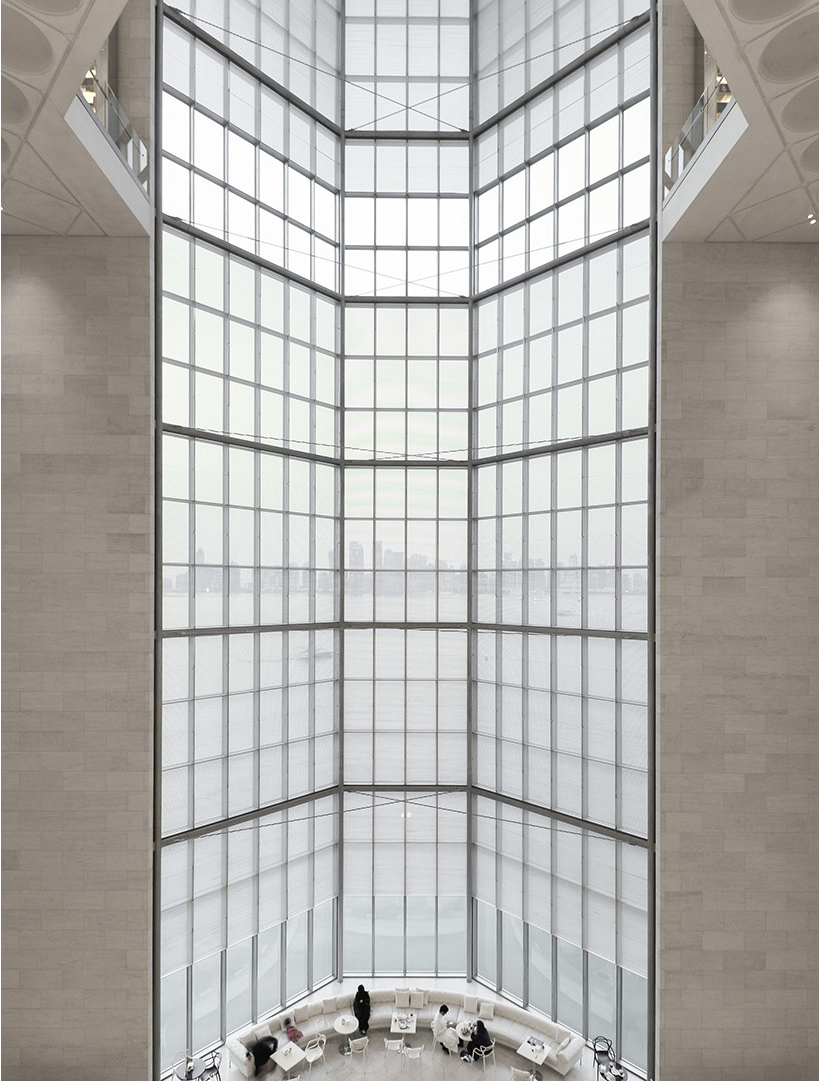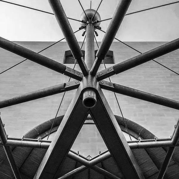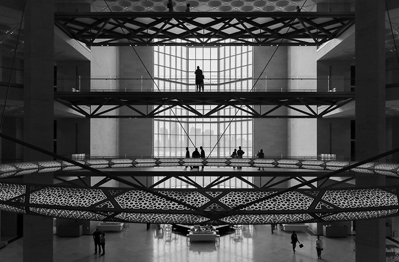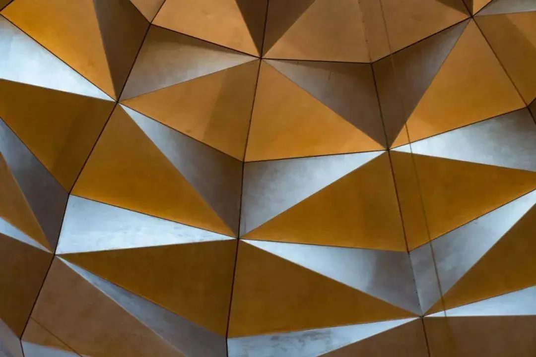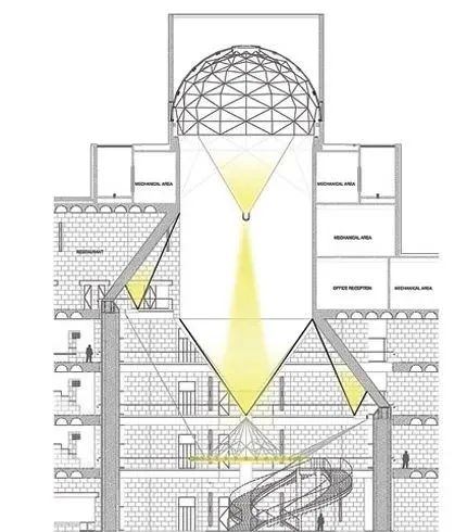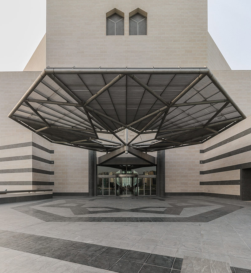 樓梯的第三級位于穹頂中心正下方,穹頂的設計靈感來自伊斯蘭傳統建筑,并通過現代設計手法進行了提煉,圖案從圓形過渡到八邊形再到正方形,最后到四個不同高度的三角形結構,形成了中庭的支柱。