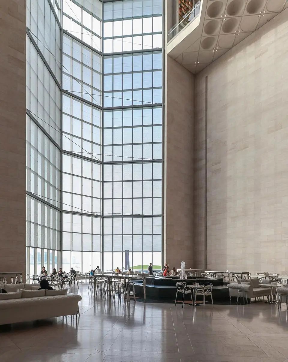 北側45米高的窗戶可以欣賞到整個海灣的壯麗全景。伊斯蘭世界的幾何圖案裝飾著整個博物館的空間,各種紋理和材料提供了獨特的背景。