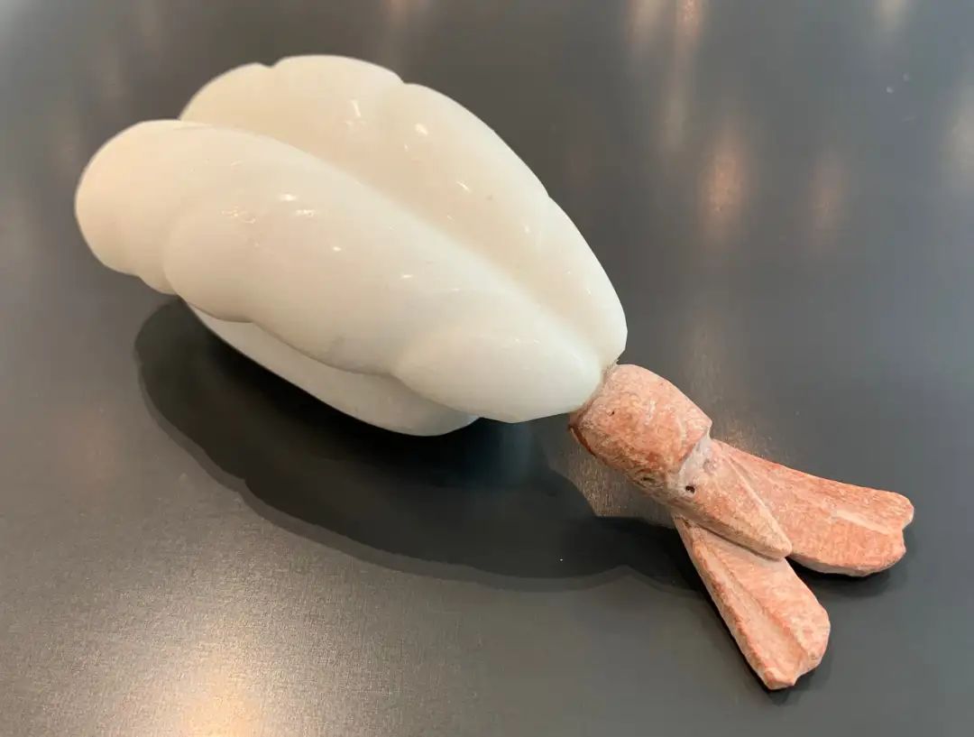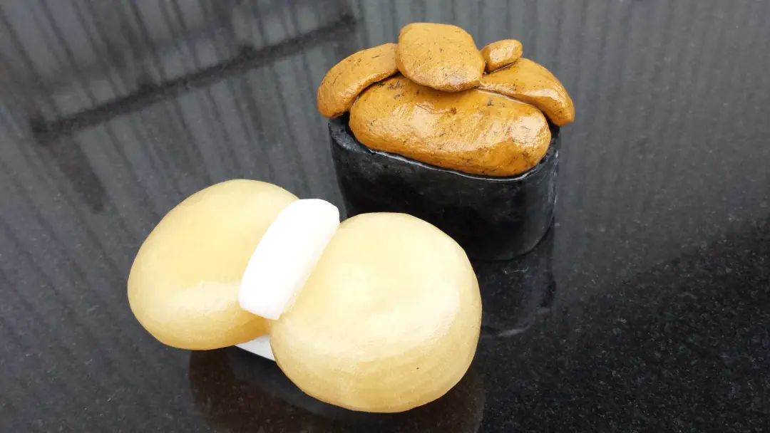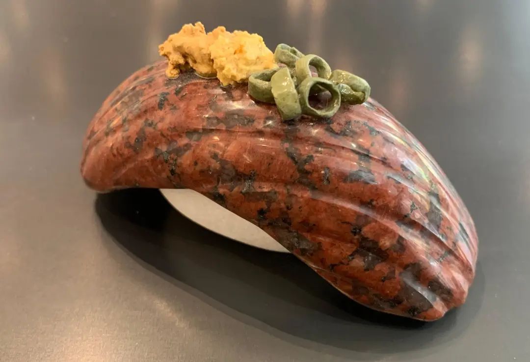 這些漂亮的壽司,潔白的米飯搭配著蝦肉、魚肉和牛肉,一看就讓人食欲大漲,如果你真的拿起來咬上一口,保證你的牙齒會被這些看起來漂亮的壽司硌下來,這是因為,這些看起來漂亮的壽司,都是由石頭雕刻而成。