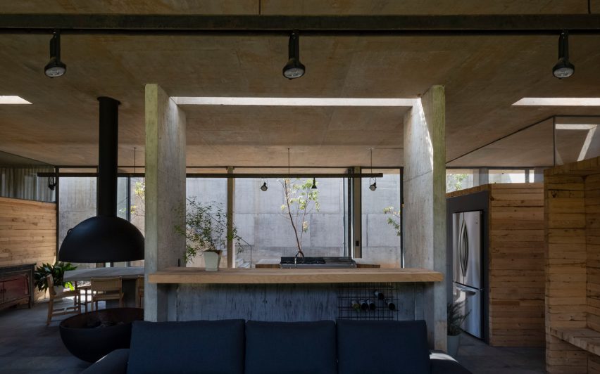 這棟墨西哥城住宅的露臺和生活空間都由混凝土板鋪就,營造出連續性,只有一面全高玻璃墻將兩者分隔,這面玻璃墻可以完全推開。