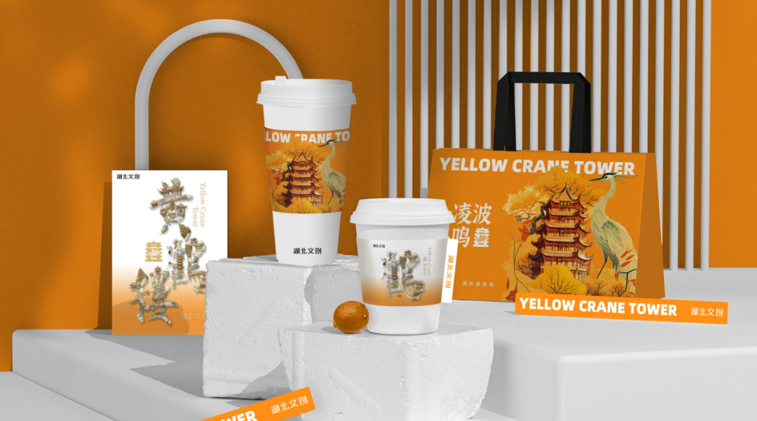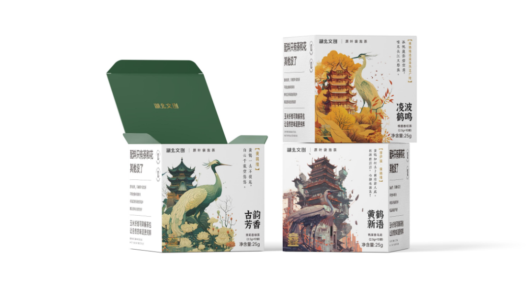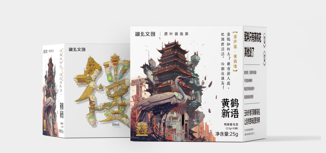 就連不少設(shè)計機構(gòu)或設(shè)計師,也紛紛嘗鮮,將自己的創(chuàng)意理念和AI技術(shù)相結(jié)合,打造獨具特色的包裝作品。像設(shè)計機構(gòu)「字繪中國」即將推出的一系列由AI輔助設(shè)計的產(chǎn)品包裝。該系列作品以黃鶴樓為創(chuàng)作主題,應(yīng)用在茶葉盒、奶茶杯等食品包裝上。