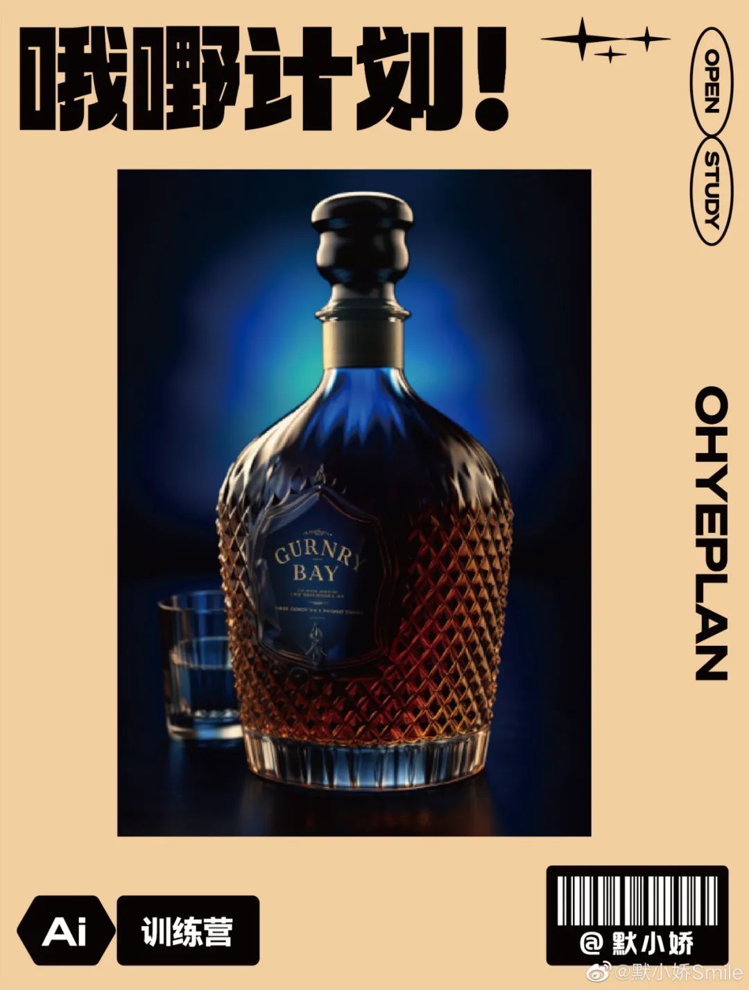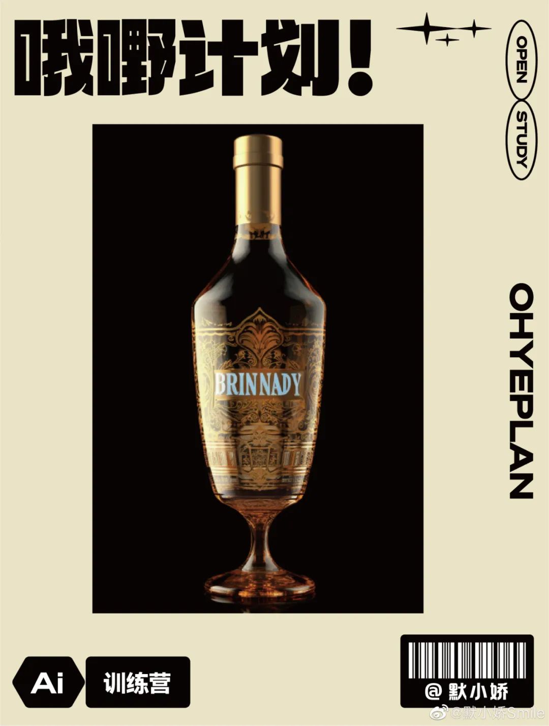 還有來自@默小嬌Smile的「哦嘢計劃」,設(shè)計出一組貴奢感十足的酒包裝,AI繪畫由胡曉波設(shè)計工作室完成。