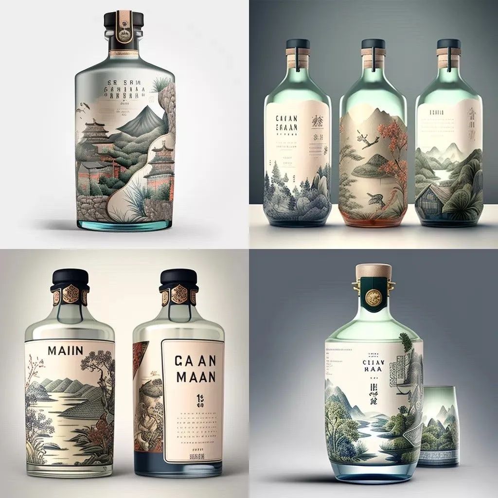 而以“東方美學(xué)”為主題的AI包裝,瓶身采用藍、白兩色作為主色,金色線條輔助搭配,勾勒出東方山水畫的絕美意境,結(jié)合剪紙工藝營造空間層次感。