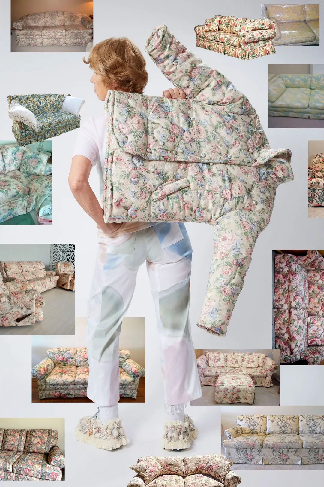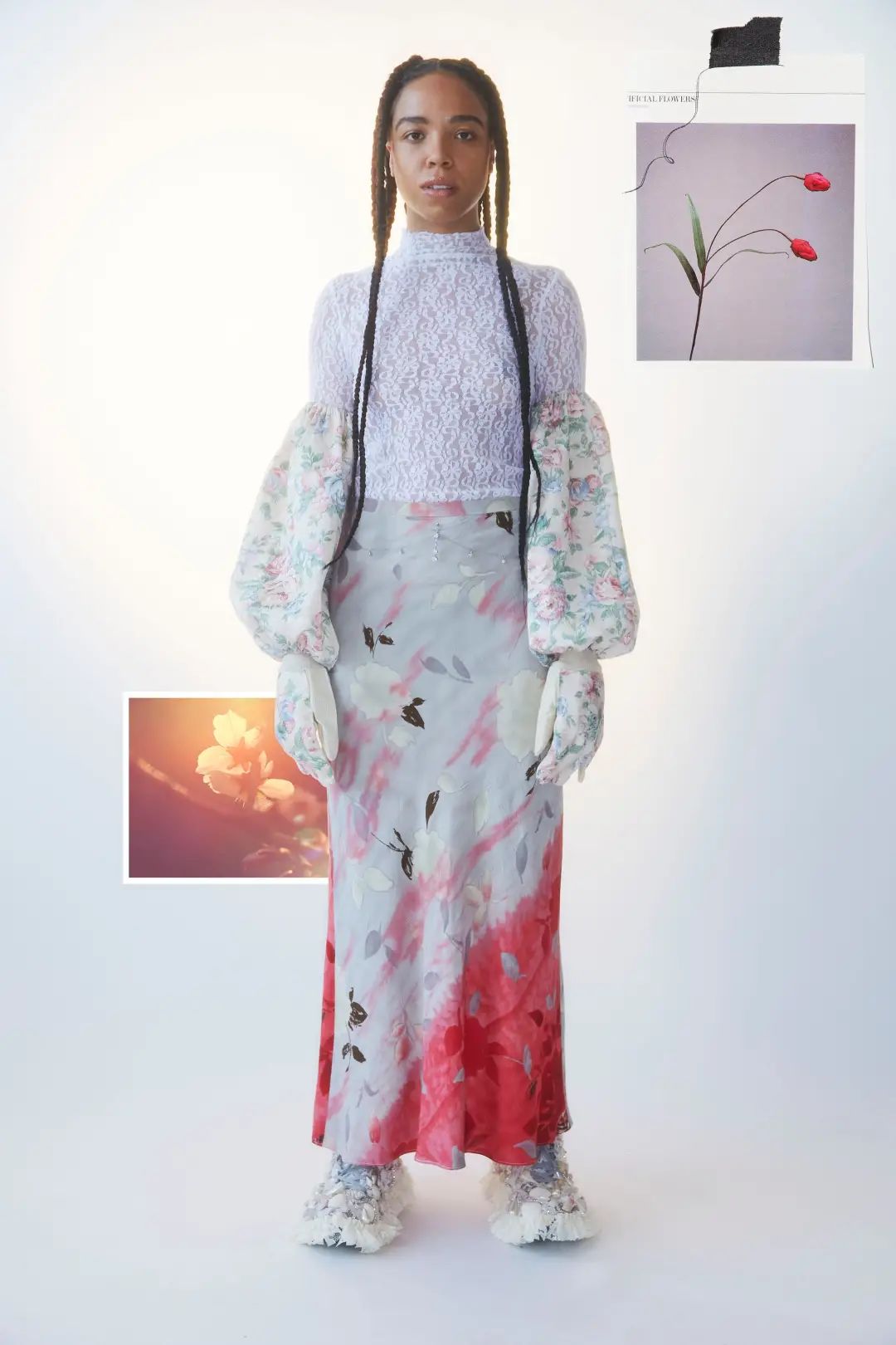 Collina Strada 的每季設計總有種具體的場景感,2020 度假系列 "Radical Transparency” 是 Charlie 執掌的首個系列,將反流行的復古元素通過先進的數碼印花技術和現代感的拼接剪裁重新塑造出來,褪色的老奶奶套袖、粗制蕾絲花邊、臺歷圖片中的假花等等,人們眼中過時的老物件被賦予了第二次生命,同時還保留了一絲親切的年代感。