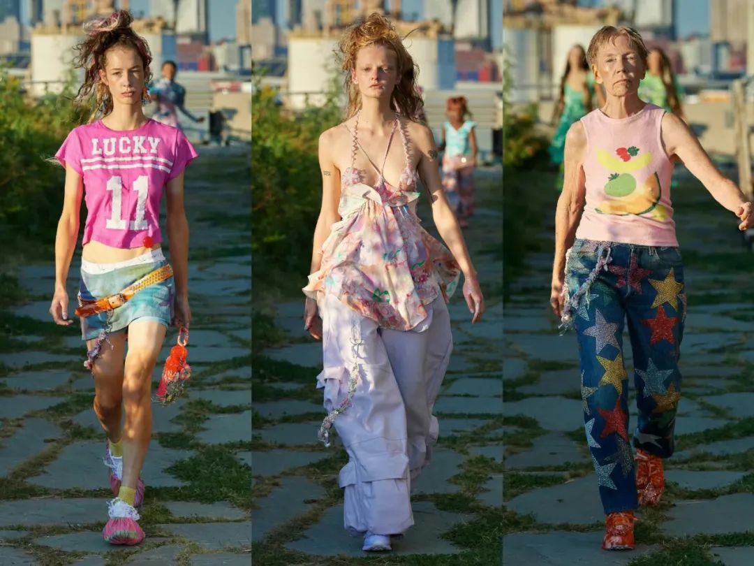 Collina Strada很好地平衡了新穎性和實用性,色彩絢麗的襯衫、衛衣、吊帶和有古怪印花的內衣。