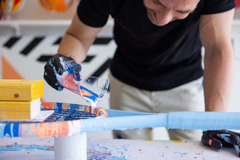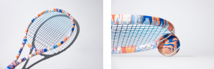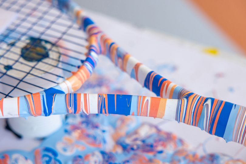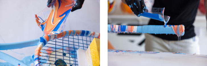 《Game, Set and Fusion》將網球運動轉化為一件生動的藝術品。他運用戲劇性的亞克力暈染技術,通過傾倒涂漆層來創造令人著迷的效果,將網球拍和網球轉化為藝術品。戲劇性的效果是為了提煉游戲的本質,并創造出捕捉其力量的獨特畫布。