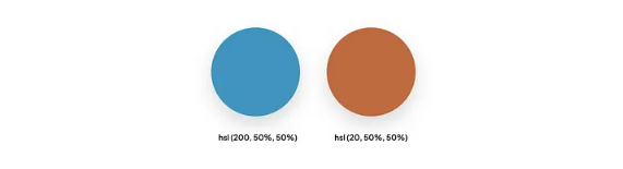 這是與您的基礎(chǔ)色相在色輪上相對(duì)的顏色。對(duì)于我們的藍(lán)色基礎(chǔ)色hsl(200,50%,50%),嘗試20左右的色相值,對(duì)應(yīng)橙色的互補(bǔ)色調(diào):hsl(20,50%,50%)。