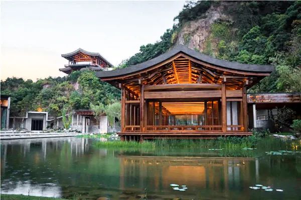 場館之中點綴著南閣、繞山廊、長橋、文潤閣、北閣等建筑,山環(huán)水繞,曲徑通幽,“宋韻”是它最大的特色。從南部的入口進入之后是大面積的水面,游廊則隨著山勢鑲嵌在山地的邊緣,因山勢而建,沿著山壁曲折變換。