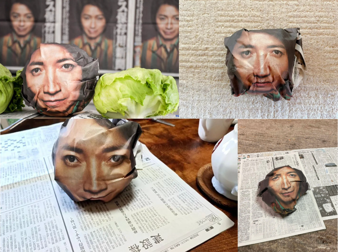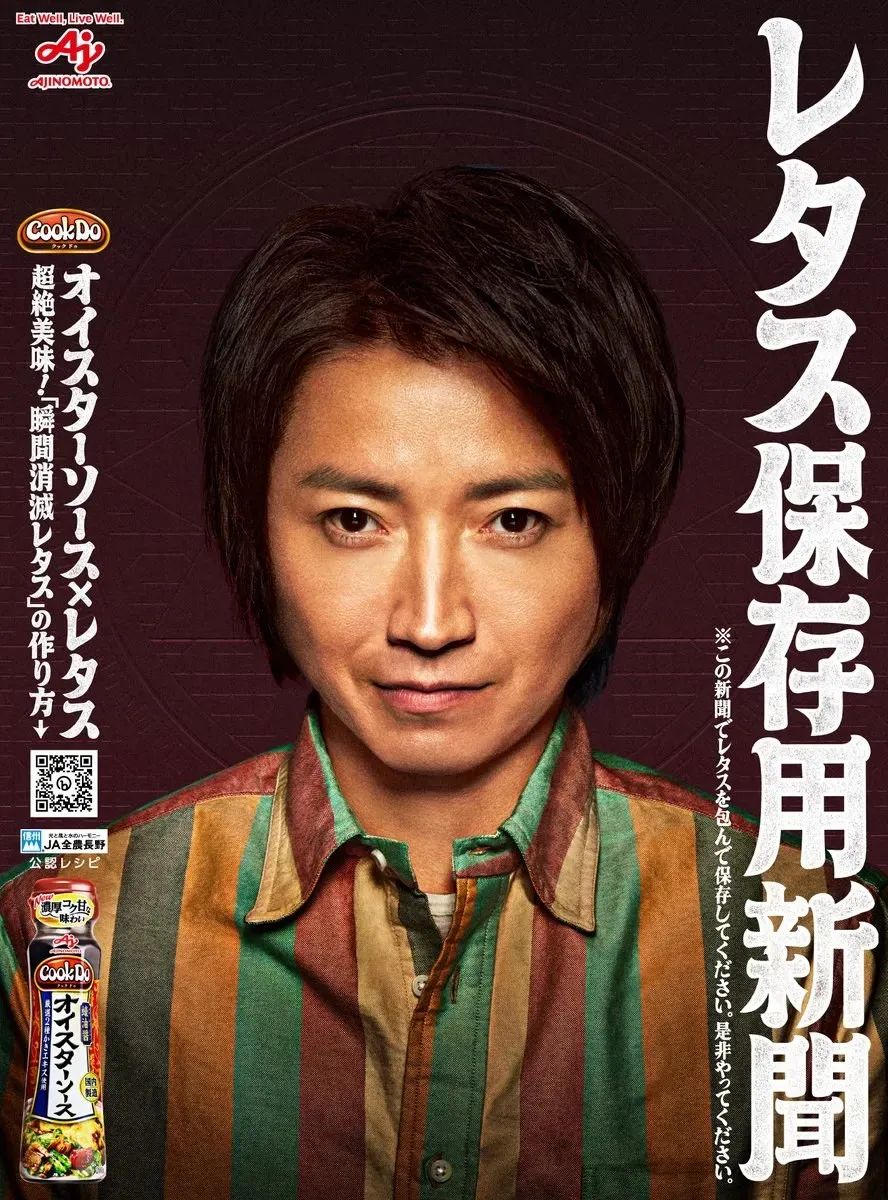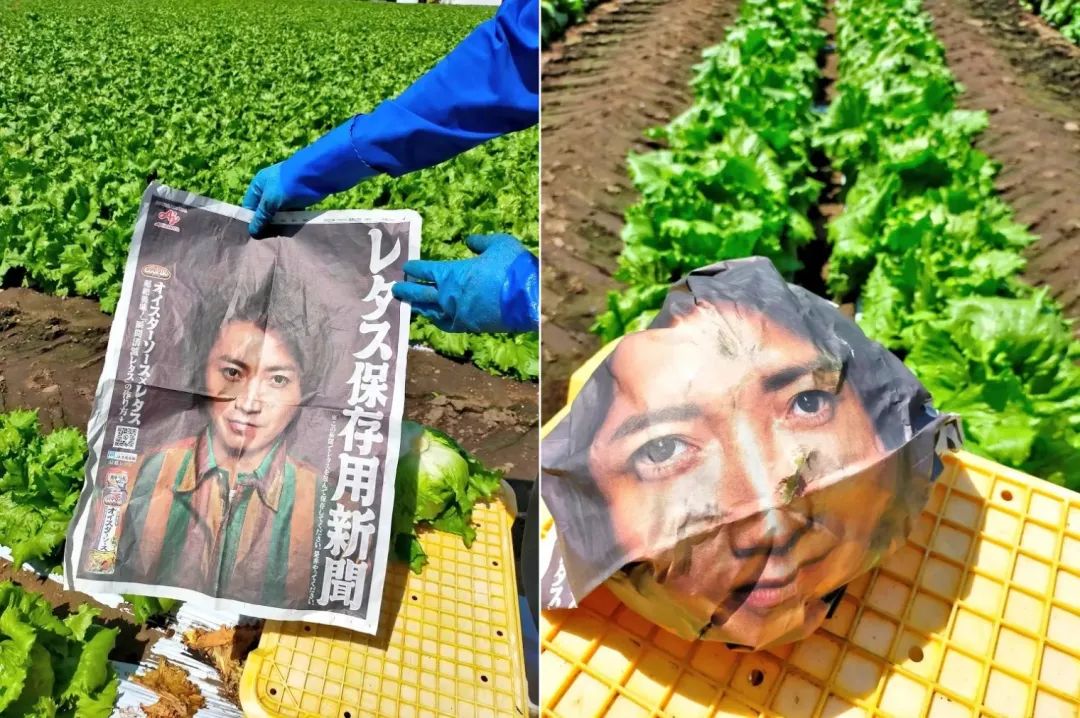 海報主標題:レタス保存用新聞(生菜保存用新聞)。副標題,翻譯過來意思是,務必試試用藤原龍也的臉來包生菜,以便保鮮更久,可以看到官方并非開玩笑。
