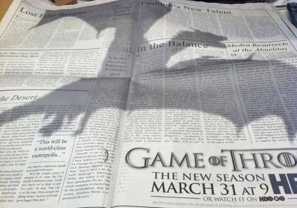 當年HBO為了宣傳《權力的游戲》,就在《紐約時報》上,通過印刷呈現了一幅巨龍的陰影圖。