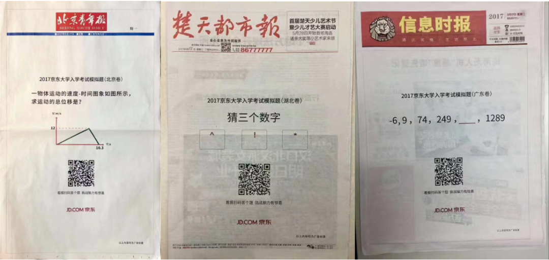 曾經618,京東聯合了各大城市的頭部紙媒,策劃了一起全國考題事件,設計了一系列趣味題目,和消費者互動,讓人耳目一新。