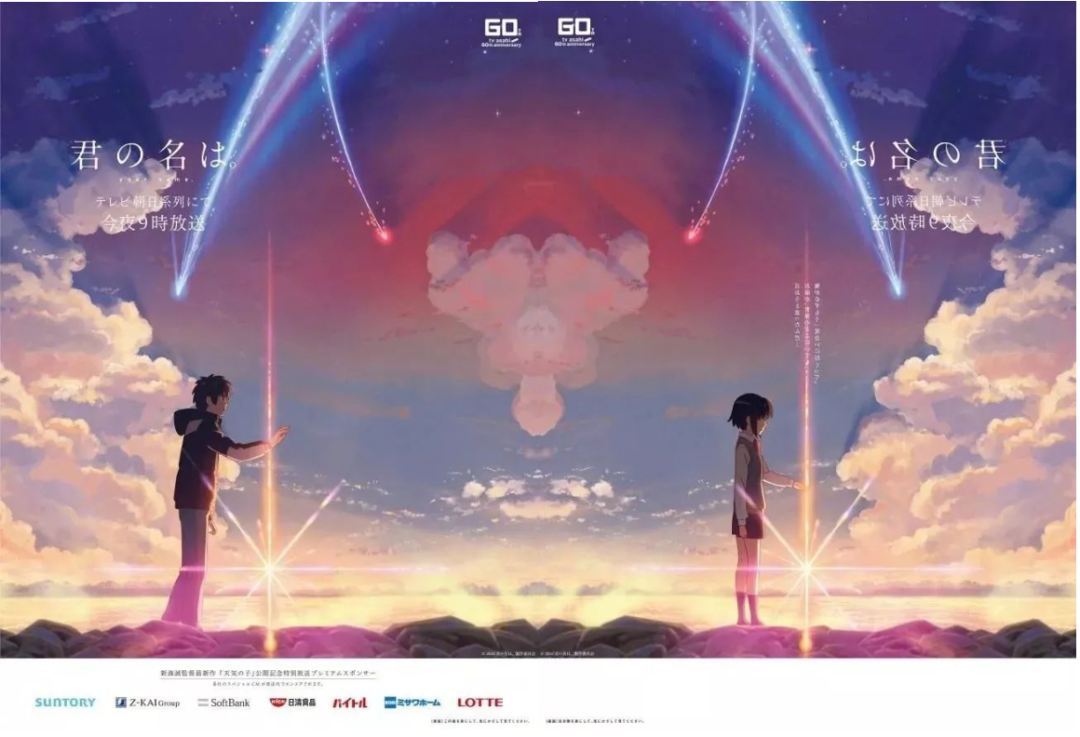 正是從這一點出發,電影《你的名字》上映前利用環境設計了一幅報紙創意,將男女主分別印在報紙的正反面,正常看一面都只有一個人,但是當迎著陽光時,便能看到兩個人相遇了。