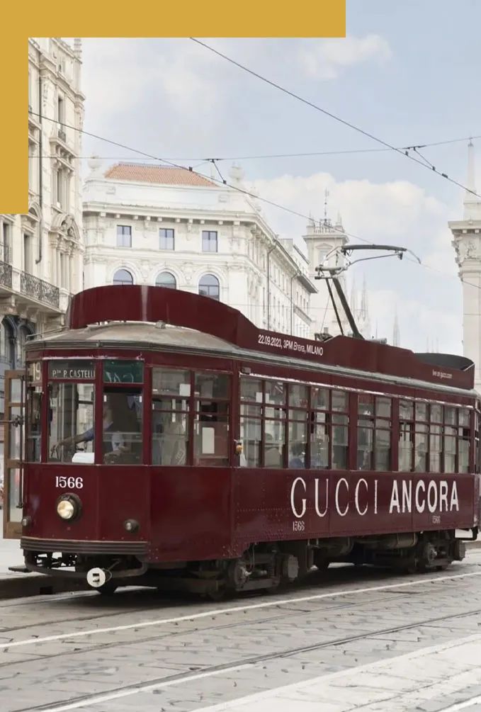 品牌此前發布的24春夏大秀預告短片,一輛印有「Gucci Ancora」字樣的酒紅色有軌電車在米蘭的大街小巷中穿梭,與裝點于城市街道建筑上的酒紅色標志遙相輝映,為大秀預熱。