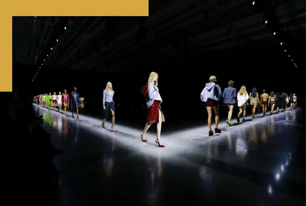 為了適應室內環境,舞臺設計變得簡約,白色光柱在黑暗中勾畫出一條矩形軌跡,將焦點完全聚焦在時裝上。
