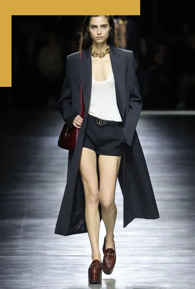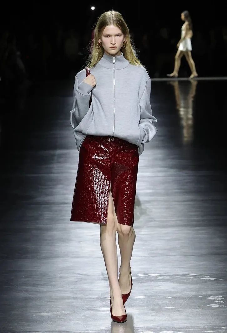 并且,Sabato De Sarno開始確立自己的重點——專注于剪裁和比例,并重復形狀以強調重點。能夠看出,一些外套、衛衣、皮革短裙的廓形剪裁方面有了一種別樣的高級感。