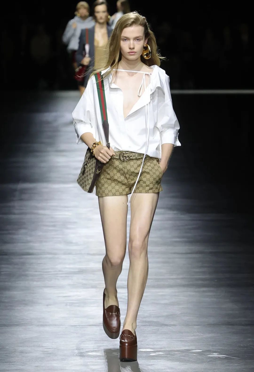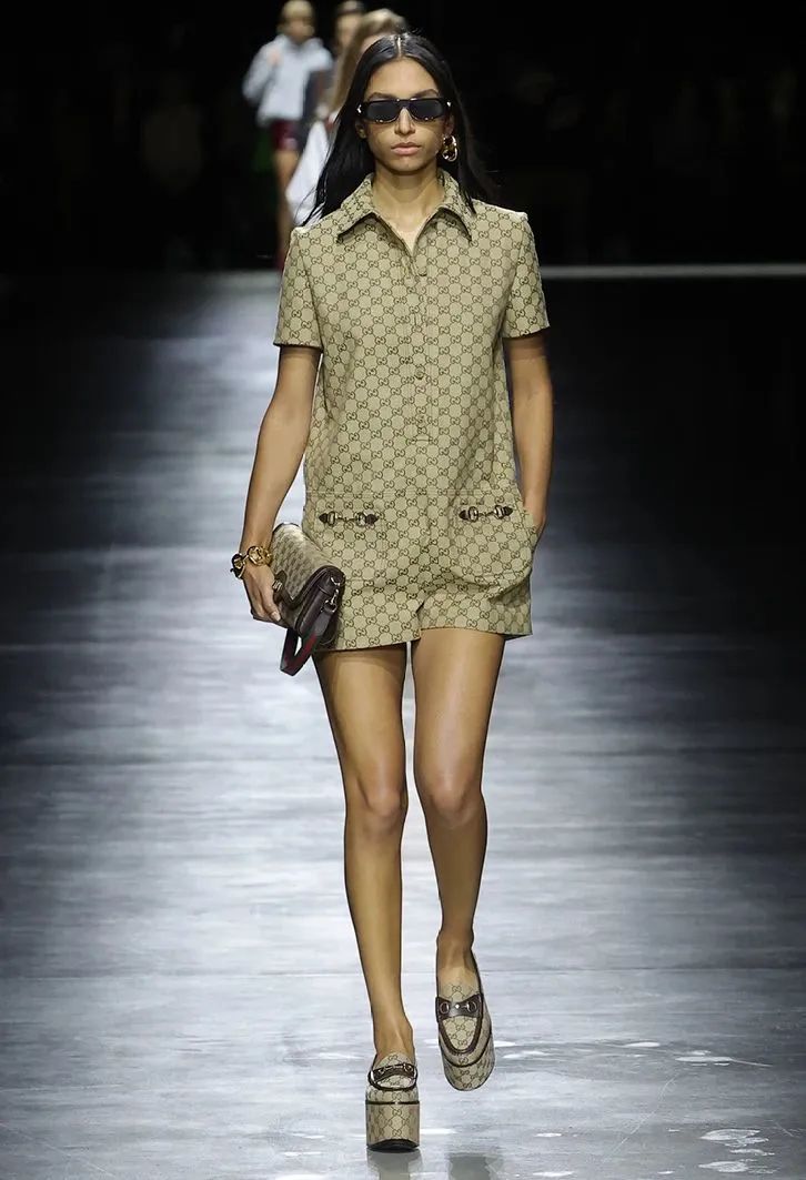 Sabato De Sarno對于Gucci經典元素的運用也恰如其分。經典的紅綠撞色綁帶和標志性的GG金屬扣腰帶頻繁出現在各種造型中。Monogram經典老花圖案不僅鋪陳于咖色的上衣和短褲上,還以隱晦的花紋形式被雕刻在漆皮連衣裙和短裙上,使設計處于精英化和年輕化之間的柔軟地帶。