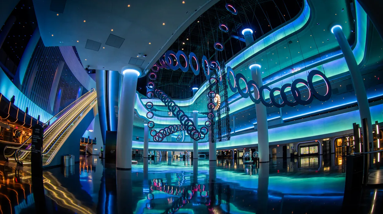 在這些環境中,設計師們加入了各種元素,旨在深化觀眾體驗,吸引人們穿越這個巨大的場所。或者正如Ohayon所說的那樣,“構建一個不斷有新發現的敘事”。臨時的插入物,比如五十英尺高的多彩全息圖像和一個懸掛在中庭頂部的互聯環裝置的藝術裝置,有助于讓重復游客感到空間一直新鮮。食品和飲料提供了彎曲的入口,富有鮮艷的顏色和琥珀色的壁爐引導觀眾進入,就像舒適的綠洲。閃閃發光的反射圖形巧妙地講述了完成這里的工程壯舉所需的數學算法的故事。觀眾將會被一個名為Aura的逼真機器人歡迎到整個場所,她會介紹內部的各種技術。