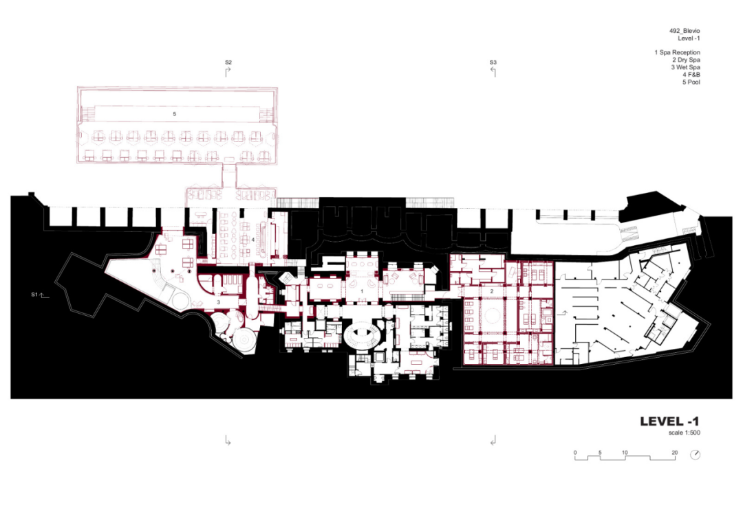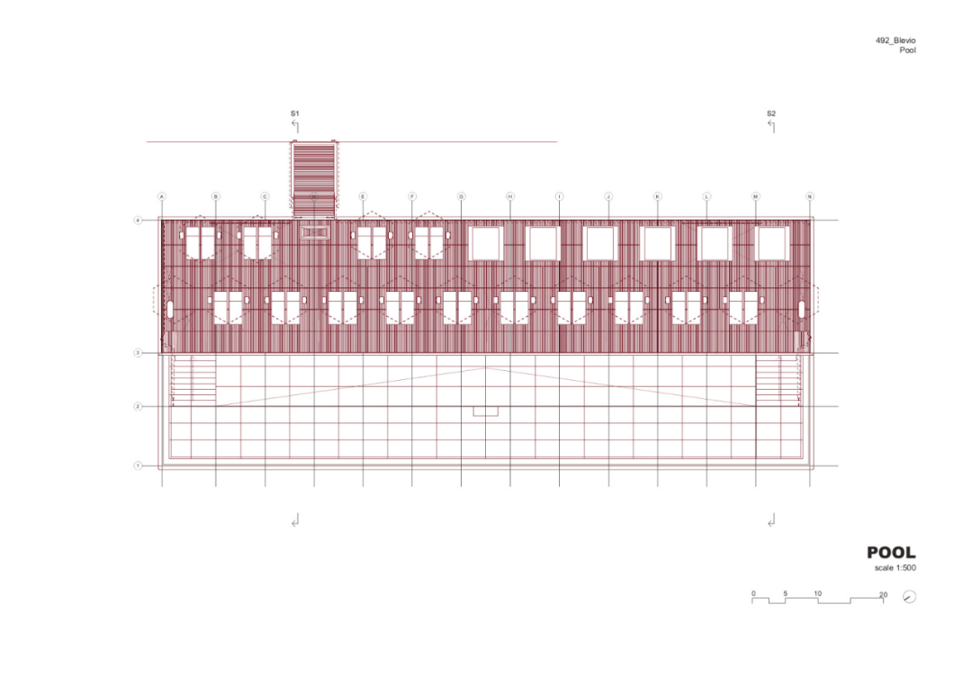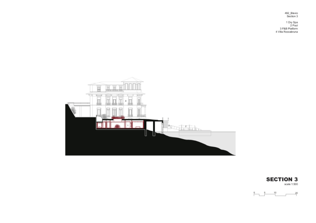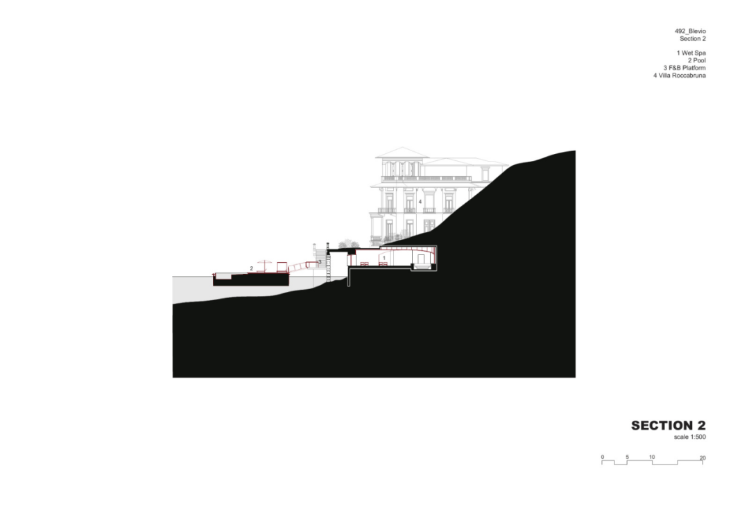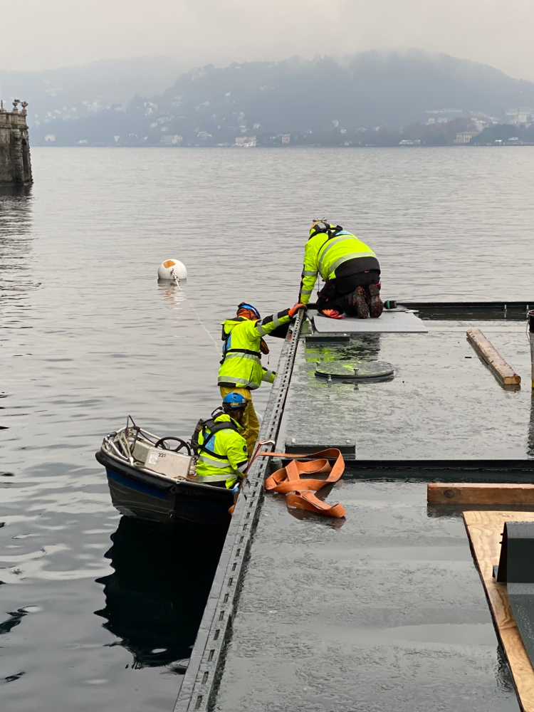 泳池主體在瑞士設計,芬蘭建造,意大利組裝,采用類似雙體船的形式來減少湖面波浪的沖擊,巧妙地固定在湖床上,并通過坡道連接到柱廊的新建酒吧和餐飲區。