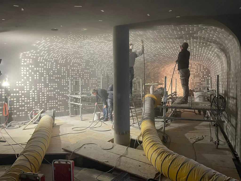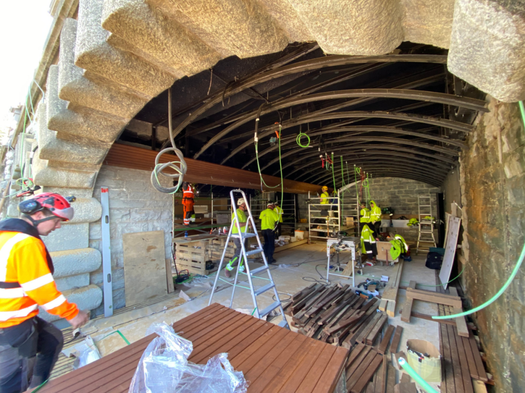 廊柱餐飲區的主體類似橋洞設計,頂部的巖石巧妙地勾勒出優美弧線,重新改建的項目對頂部和周邊進行了加固處理,在內部增加了很多結構支撐的鋼板,巧妙地隱藏在石墻內部。