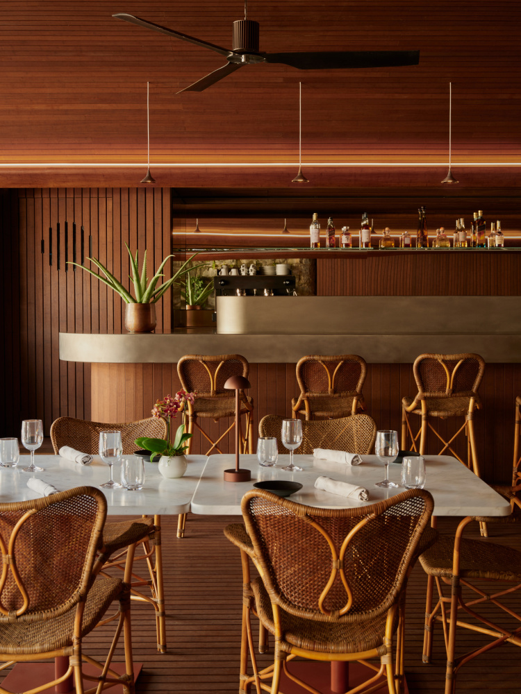 酒吧和用餐區無論地磚還是墻體,都沿用亮麗的色彩和復古材質,紅色調印花墻紙營造一種復古精致,里面的家具和燈飾采用金色,打造奢華的感覺,餐廳和酒吧提供各式各樣的美味菜肴和酒水。