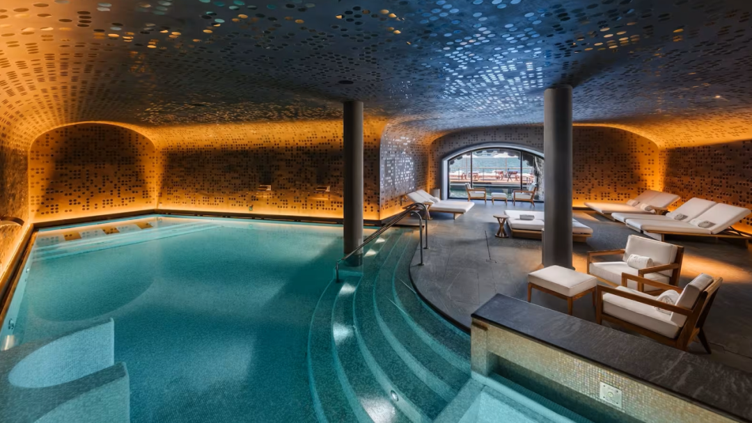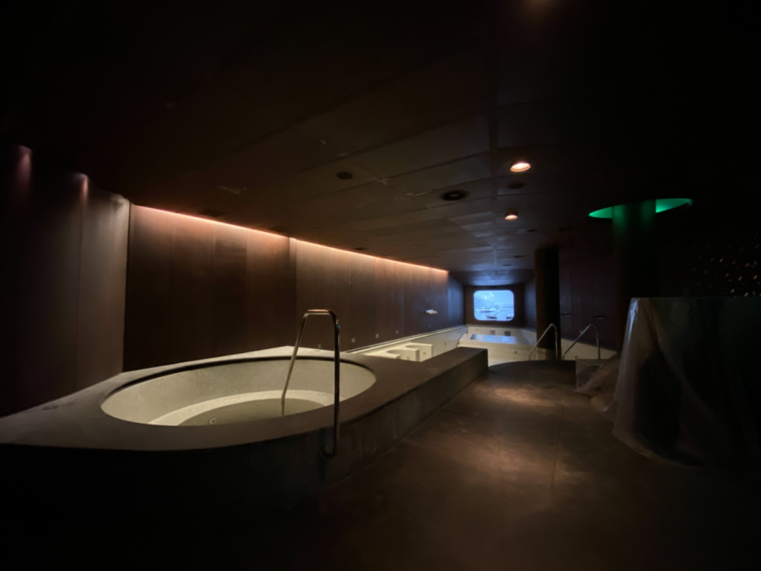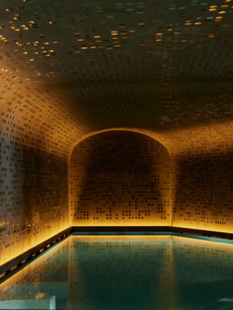 除了餐廳和酒吧之外,里面還增加了室內的泳池和 spa 空間。這個區域處于地下層,設計師巧妙地增加了一些壁燈和燈帶設計,讓整個空間夢幻又溫馨。