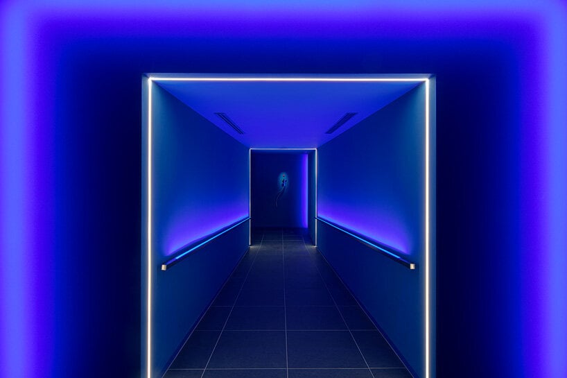 在福岡的皇宮酒店的一條藍(lán)色走廊。