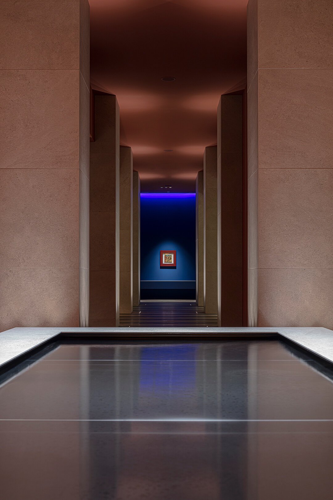 這一變化以深藍(lán)色入口和裝飾著花瓶的墻壁形成了大膽的對(duì)比,象征著自然和城市生活的共存。地下室現(xiàn)在容納了新的前臺(tái)和名為“埃爾多拉多”的休息室,由Aldo Rossi親自設(shè)計(jì)。休息室內(nèi)設(shè)有一個(gè)酒柜,向酒店標(biāo)志性的外立面致敬。為了為環(huán)境增加活力,Uchida的晚期作品“跳舞的水”雕塑也被加入其中,象征著相遇和回憶。休息室的桌椅保留了原始設(shè)計(jì)的美學(xué)。
