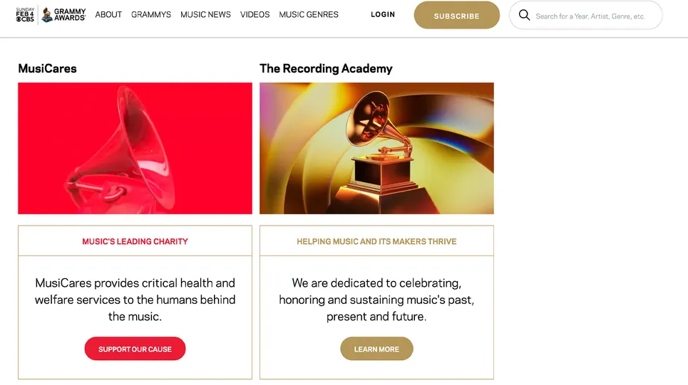 格萊美獎的網站使用金色的裝飾來與其標志性的獎杯相匹配,營造出豪華感(圖片來源:格萊美獎網站)。