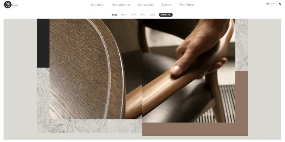 在網頁設計中,棕色通常與木質紋理一起使用,營造出木制小屋的古老和鄉村氛圍。盡管技術網站通常以更強烈、更大膽的色調為主,但B&O Play的微網站成功地使用了棕色。柔和的色調暗示了科技產品更高檔、更人性化的一面。自然的象征也依然存在:木材和皮革在主視頻中占據重要地位,而大理石效果則用于背景。