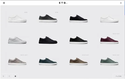 為了減輕這種冷漠感,一些網頁設計師會傾向于使用象牙色或奶油色。這些白色的變種更加柔和,甚至不那么顯眼,但具有相同的極簡和互補特性。它們是白色的更具舒適感和不那么嚴厲的替代品。鞋公司ETQ使用主導的米白色背景,將用戶的注意力集中在鞋子上。