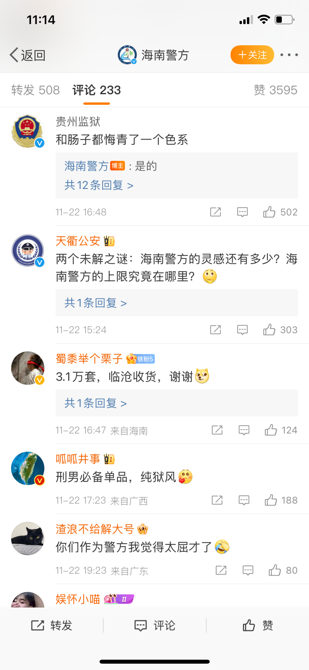 貴州監獄官方評論:和腸子都悔青了一個色系。