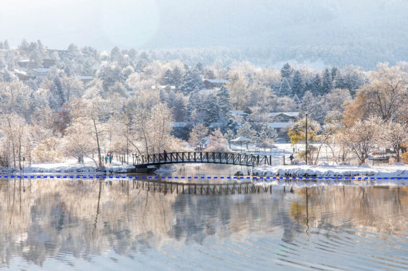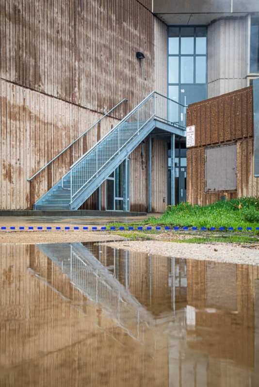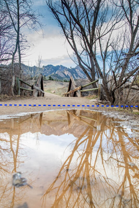如果你真的想嘗試水平對稱,下次找到一個水坑(或自己創(chuàng)造一個),盡量把相機靠近它。嘗試改變透視,讓它看起來像你站在湖邊一樣。如果能讓水坑創(chuàng)建的倒影占據(jù)整個圖像的前景,通常可以制造出一個大水域的錯覺。如果沒有風(fēng)吹動水面產(chǎn)生漣漪,會更有幫助,但有時輕微的微風(fēng)也可以行得通。