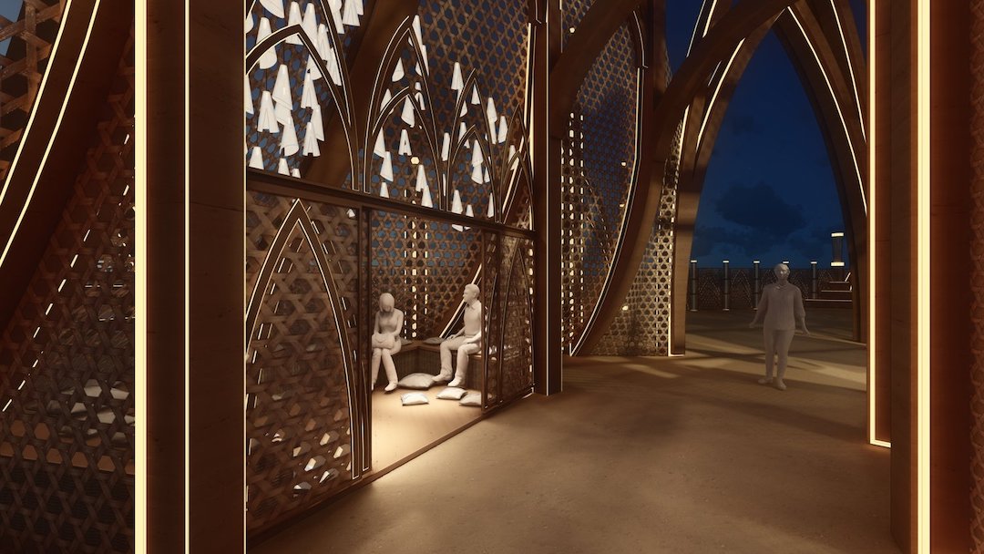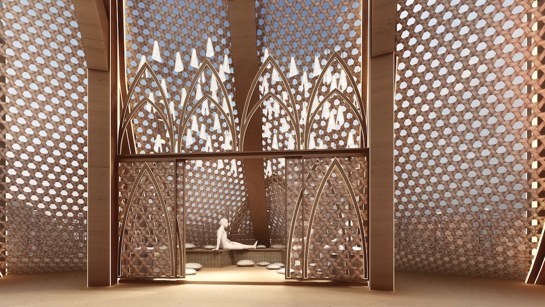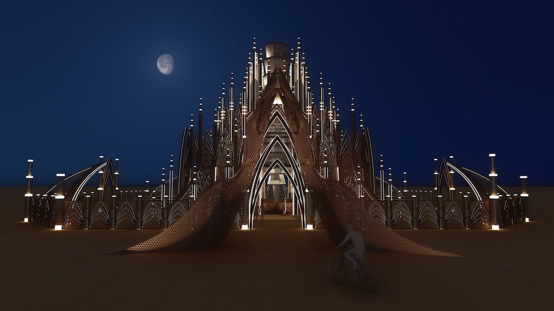 在今年的火人節上,以內華達沙漠的廣闊畫布為背景,“共同體之殿”成為團結和藝術擴張的燈塔。這座寺廟高達70多英尺,由藝術家卡Caroline Ghosn和卡邁工作室Kamai Studio的建筑師Maissa Sader牽頭,慶祝集體創造力的力量。它將教堂建筑的莊嚴與黎巴嫩編織技術的復雜之美結合在一起。