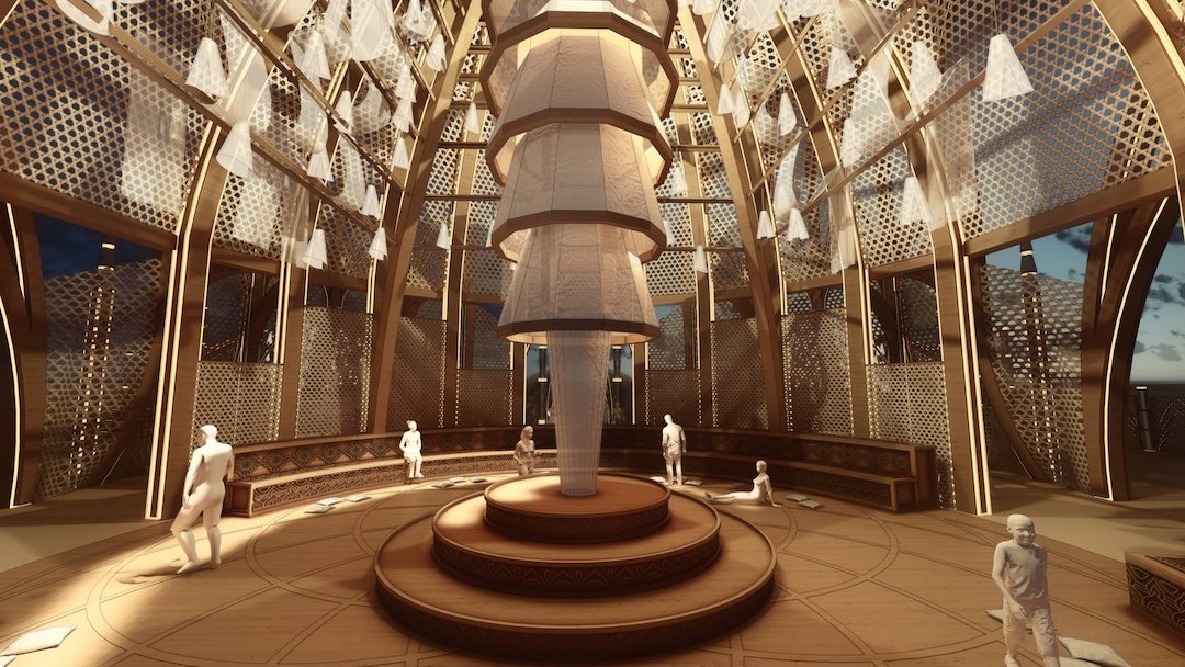 共同體之殿直徑94英尺,高達70英尺,是一個大型建筑與小型工藝親密結合的空間。戈恩的愿景將這些元素帶入了一種和諧的平衡,在火人節的宏偉中提供了一個反思的地方。保護區的設計強調可持續和重新利用的材料,也為所有技能水平的志愿者提供了創造性的參與,體現了節日的包容性和共同努力的精神。