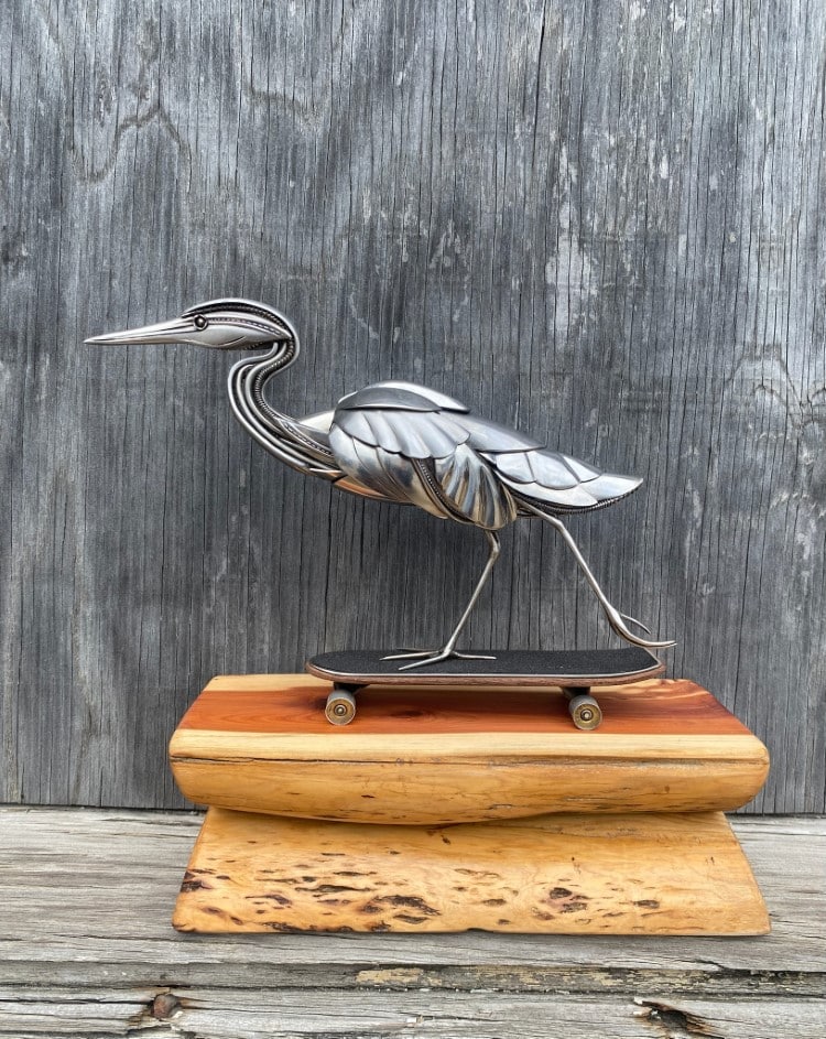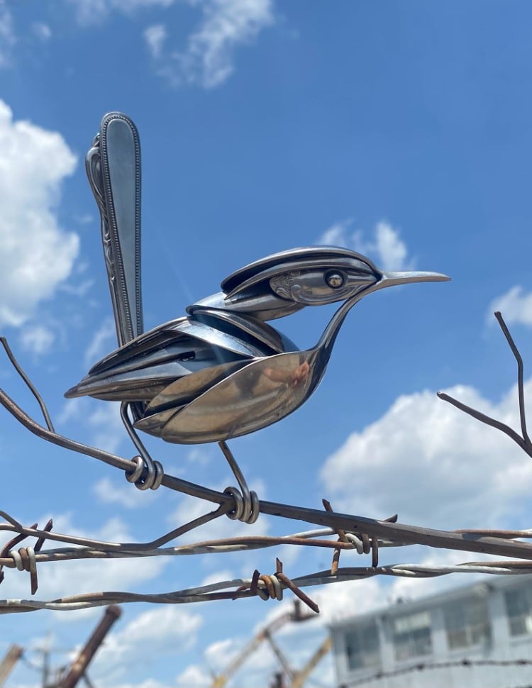 Wilson擅長利用餐具的形狀和紋理來創造鳥類的細節。刀叉柄上的凹槽可能變成翅膀的羽毛,而勺子的弧度則有助于塑造鳥類的頭部。雖然Wilson喜歡使用易于辨認和關聯的材料,但他也欣賞隨著雕塑變得越來越精致,餐具本身變得越來越抽象的這種變化。