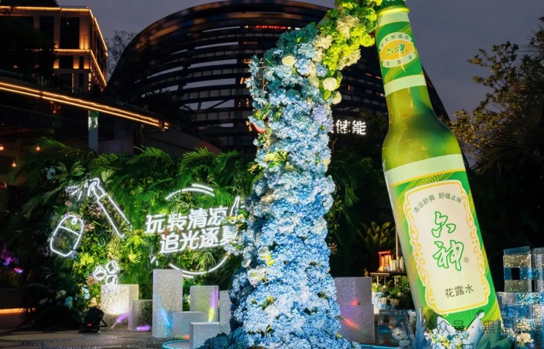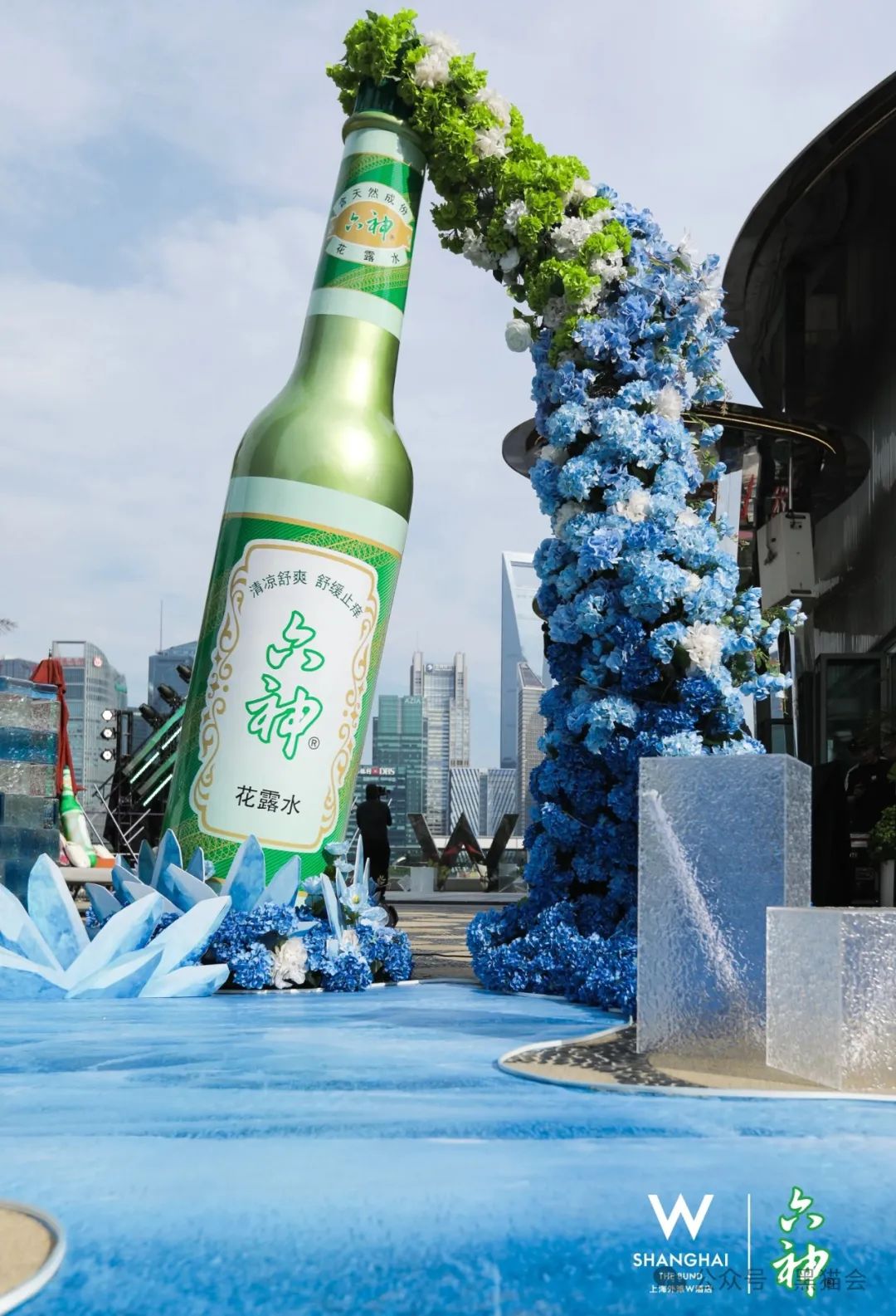 六神將其經(jīng)典產(chǎn)品——花露水,打造成了巨型藝術(shù)裝置,與上海標(biāo)志性建筑隔江呼應(yīng)。