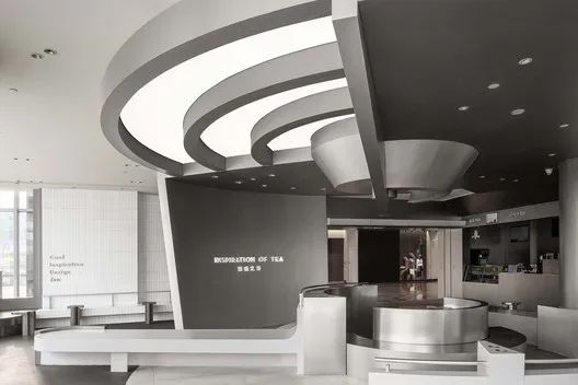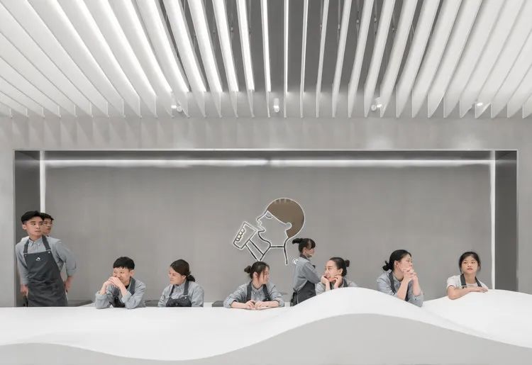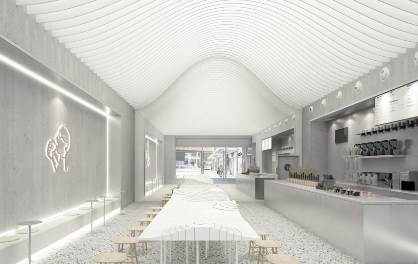 設(shè)計師將水的曲折抬升到桌子的高度,讓整個曲線桌子在門店里流動,門店里的所有茶客坐在了同一張桌子上,自然形成了凝聚氛圍。