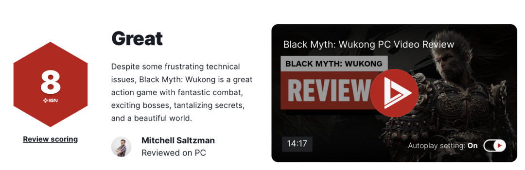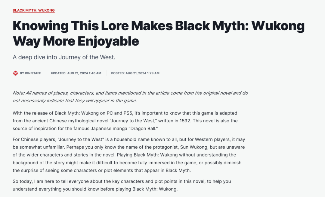 有意思的是,在給出八分的評分之后,在當地時間21日,IGN 全球站發表了一篇名為《了解這些傳說,更享受〈黑神話:悟空〉》的長文,向海外玩家科普《黑神話:悟空》背后的文學支撐 —— 《西游記》。