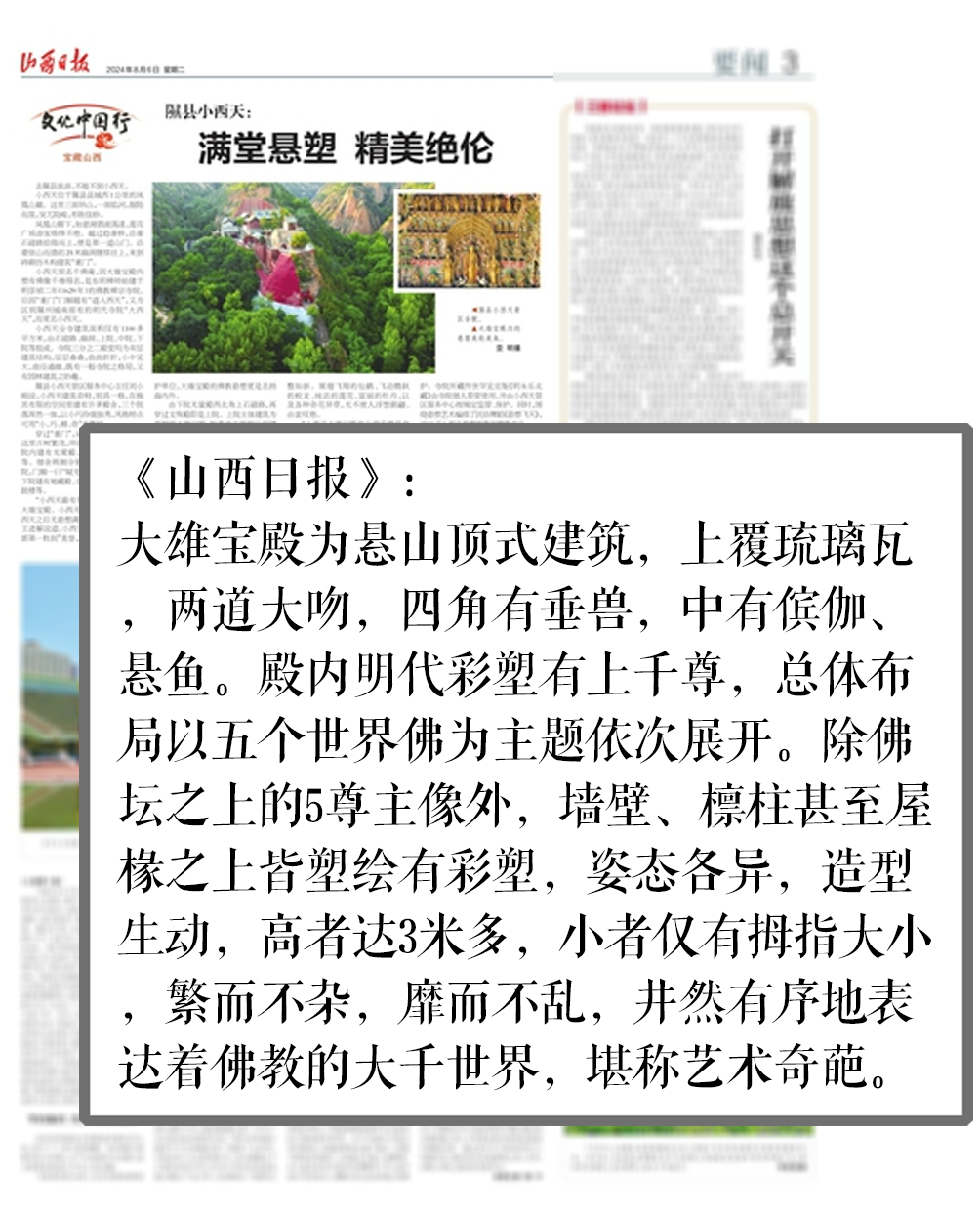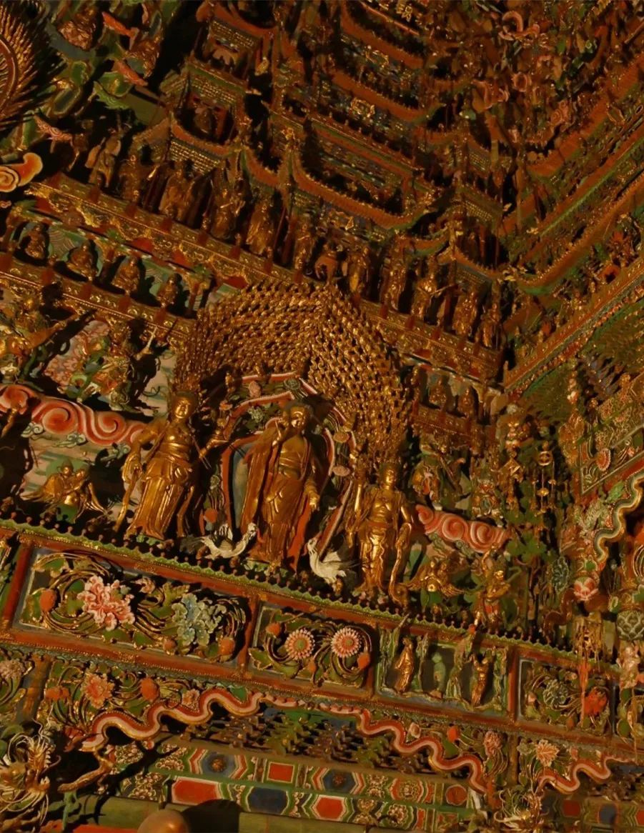 在隰縣,小西天寺院依山疊造,彩畫綺麗絢爛。墻壁上,一幅幅立體的彩繪建筑與栩栩如生的塑像交相輝映,它們錯落有致地鋪展開來,層層疊疊間展現出一種難以言喻的精巧與絕倫。