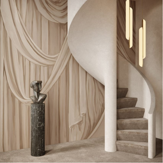 英國照明設計師Lee Broom與本地工作室Calico Wallpaper合作的"Overture"系列壁紙,讓整面墻仿佛被流動織物覆蓋。Broom向Dezeen透露,這種設計延續了他早年制作音樂活動橫幅的創作脈絡。