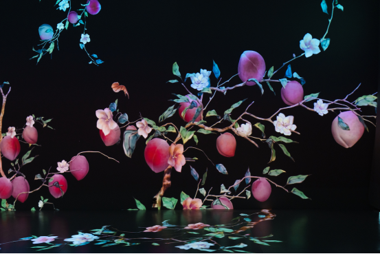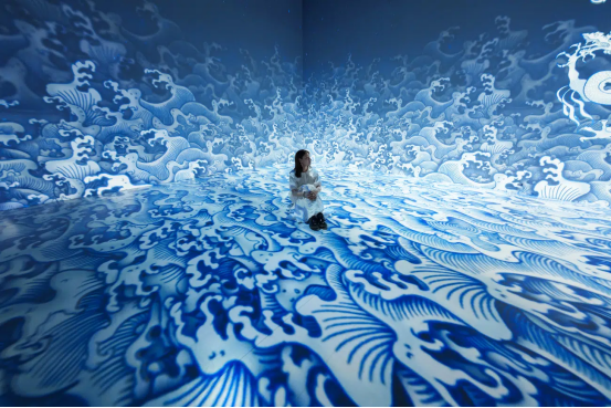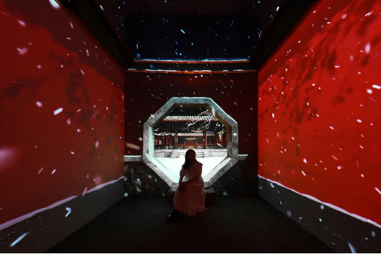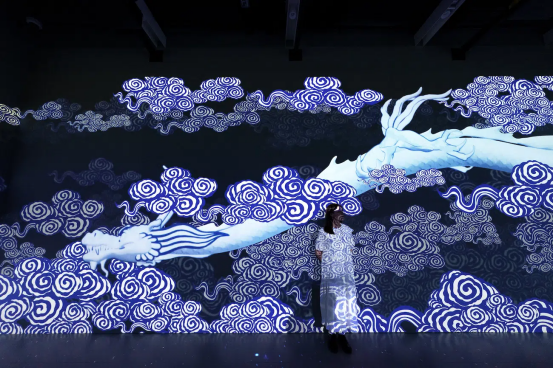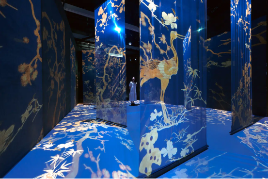 展覽運用數字技術重新詮釋了博物館收藏的建筑構件、陶瓷和刺繡藝術品,打造了七個獨特的展示空間。在這些空間中,從云間穿行的龍紋到庭院中嬉戲的貓影,靜態的紋樣被賦予了動態的生命。墻壁變成了活生生的畫布,為傳統紋樣揭開了新的維度。