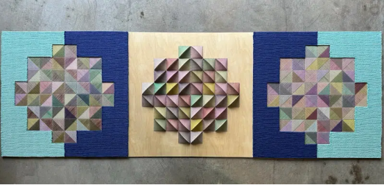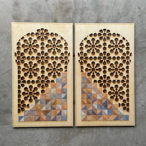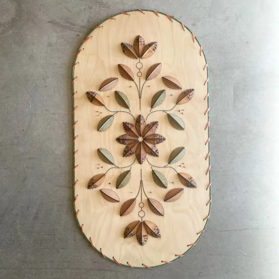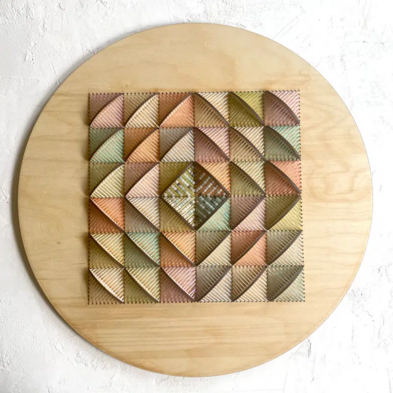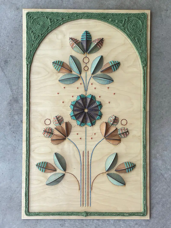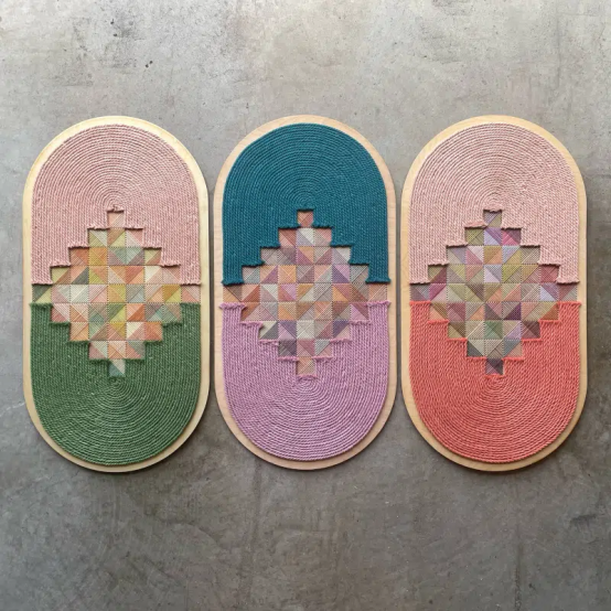 在達拉斯藝術家Nosheen Iqbal的手中,刺繡不再局限于布料載體。這位扎根巴基斯坦文化傳統的創作者,將 Punjabi 手工藝與伊斯蘭建筑美學相融合,開創出以木材為基底的立體刺繡藝術。她的作品被定義為"對自我存續與身份認同的探索",那些祖輩傳承的明艷色彩與繁復紋樣,通過觸感與光學的重新演繹,化為木質畫布上盛開的植物卷須與幾何圖騰。
