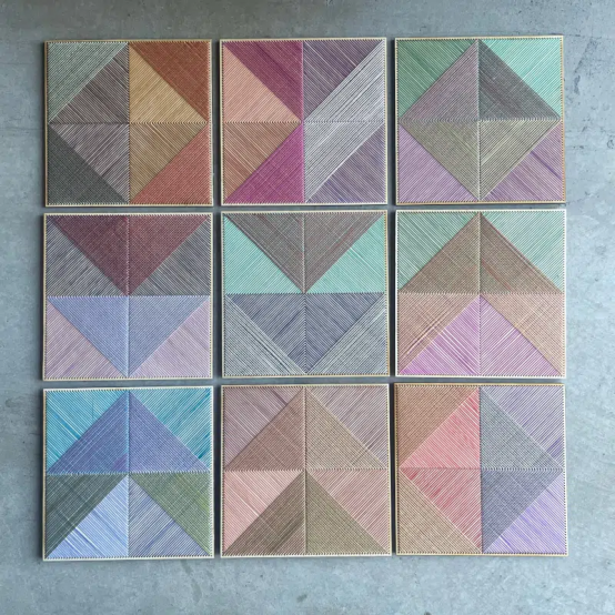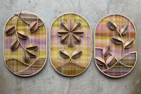 這些以圓形、方形或花卉輪廓為基底的木質結構,或被繡線完全覆蓋,或刻意裸露部分肌理,形成光影交錯的動態雕塑。"彩色繡線并非單純裝飾,"藝術家描述道,"當觀者移動時,它們化作飽和的路徑,展現色彩強度與深度的變化,創造流動的視覺體驗。"